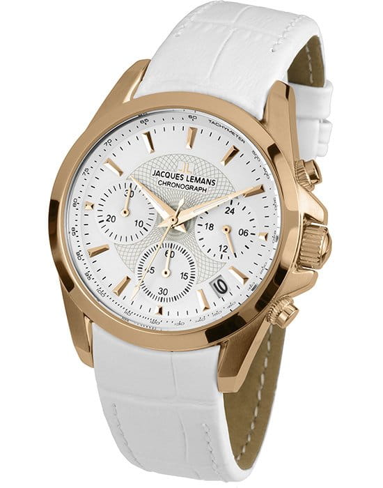 Часы Жак Леман из коллекции Liverpool женская многофункциональная модель Корпус диаметром 35 мм выполнен из высококачественной легированной стали Циферблат, украшенный гильошем, подчеркивают структурные риски и стрелки, покрытые светонакопителем Секундная стрелка в виде стрелы привлекает внимание Часы оснащены хронографом, а в рант вынесена тахиметрическая шкала для определения скорости Окно даты расположено между 4 и 5 часами Кварцевый механизм обеспечивает точность хода, а усиленное стекло Crystex защиту от удара Герметичность до 10 АТМ гарантирует надежную защиту от воды Часы Жак Леман — сочетание функциональности и изысканного дизайна