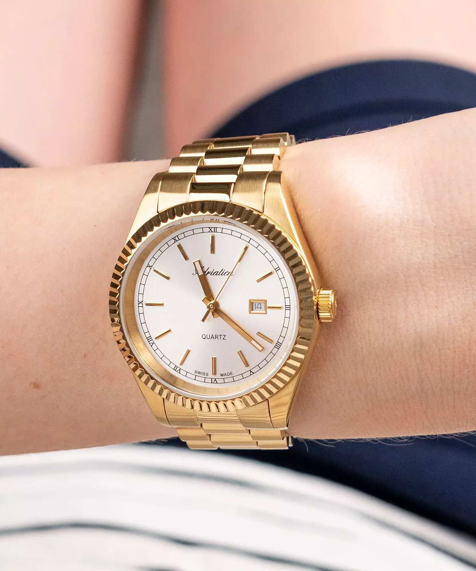 Женские кварцевые часы Adriatica A3090.1113QXL — изысканная швейцарская классика с тёплым золотым оттенком. Круглый корпус размером 36 мм из стали с PVD-покрытиемPVDУльтратонкое покрытие наносится в технике вакуумного напыления, сочетает в себе нитрид титана особой прочности со слоем золота или оксида хрома. Несёт в себе декоративную или защитную функцию. цвета жёлтого золота, циферблат с солнечной текстурой Sunray и штрихами, окошко даты в положении 3 часов. Стекло — минеральноеМинеральное стеклоМинеральное стекло представляет собой искусственно выращенный минерал кварца. Такое стекло отличается особой устойчивостью к повреждениям и царапинам. Уступает по некоторым качествам сапфировому стеклу. с сапфировым покрытиемСапфировое стеклоПрочный и надёжный материал из кристалла сапфира синтетического происхождения, характеризующийся особой твёрдостью и устойчивостью к царапинам и повреждениям.. Механизм — швейцарский кварцевый Ronda 785. Водонепроницаемость 50 м. Рифлёный безельБезельВнешний ободок, закрепляющий стекло. В спортивных часах так называется поворотное кольцо с делениями на циферблате, выполняет роль таймера – замеряет отрезки времени на шкале. Неподвижный безель – элемент декора. Однонаправленно вращающийся безель на дайверских часах позволяет фиксировать моменты погружения и выныривания на поверхность. и завинчивающаяся заводная головка подчёркивают внимание к деталям. Браслет — стальной с PVD-покрытиемPVDУльтратонкое покрытие наносится в технике вакуумного напыления, сочетает в себе нитрид титана особой прочности со слоем золота или оксида хрома. Несёт в себе декоративную или защитную функцию. на раскладной застёжкеРаскладная застёжкаТакой тип застёжки используется только на браслетах из металла. Она никогда не раскрывается полностью, происходит разделение на 2 и более частей. Раскладывающая застёжка снизит вероятность потери часов к минимуму.. Идеальный выбор для тех, кто ценит швейцарское качество и элегантный женственный стиль.