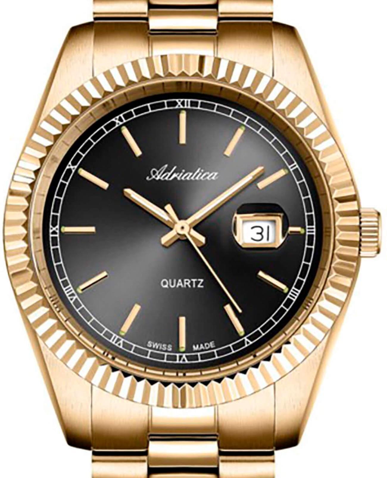 Женские кварцевые часы Adriatica A3090.1116QXL — изысканная швейцарская классика с тёплым золотым оттенком. Круглый корпус размером 36 мм из стали с PVD-покрытиемPVDУльтратонкое покрытие наносится в технике вакуумного напыления, сочетает в себе нитрид титана особой прочности со слоем золота или оксида хрома. Несёт в себе декоративную или защитную функцию. цвета жёлтого золота, циферблат с солнечной текстурой Sunray и штрихами, окошко даты в положении 3 часов. Стекло — минеральноеМинеральное стеклоМинеральное стекло представляет собой искусственно выращенный минерал кварца. Такое стекло отличается особой устойчивостью к повреждениям и царапинам. Уступает по некоторым качествам сапфировому стеклу. с сапфировым покрытиемСапфировое стеклоПрочный и надёжный материал из кристалла сапфира синтетического происхождения, характеризующийся особой твёрдостью и устойчивостью к царапинам и повреждениям.. Механизм — швейцарский кварцевый Ronda 785. Водонепроницаемость 50 м. Рифлёный безельБезельВнешний ободок, закрепляющий стекло. В спортивных часах так называется поворотное кольцо с делениями на циферблате, выполняет роль таймера – замеряет отрезки времени на шкале. Неподвижный безель – элемент декора. Однонаправленно вращающийся безель на дайверских часах позволяет фиксировать моменты погружения и выныривания на поверхность. и завинчивающаяся заводная головка подчёркивают внимание к деталям. Браслет — стальной с PVD-покрытиемPVDУльтратонкое покрытие наносится в технике вакуумного напыления, сочетает в себе нитрид титана особой прочности со слоем золота или оксида хрома. Несёт в себе декоративную или защитную функцию. на раскладной застёжкеРаскладная застёжкаТакой тип застёжки используется только на браслетах из металла. Она никогда не раскрывается полностью, происходит разделение на 2 и более частей. Раскладывающая застёжка снизит вероятность потери часов к минимуму.. Идеальный выбор для тех, кто ценит швейцарское качество и элегантный женственный стиль.
