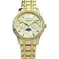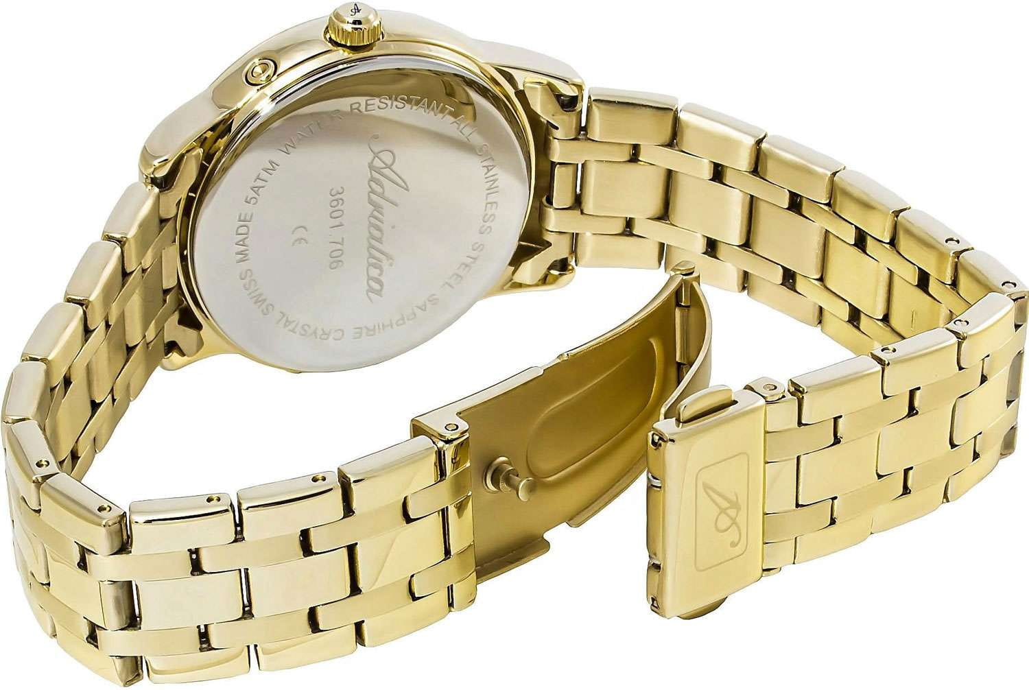 Женские часы AdriaticaA3601.1117QFZ воплощают в себе утонченность и надежность швейцарского часового искусства. Эти часы идеально подойдут для тех, кто ценит стиль и качество в одном изделии. Золотистый циферблат защищен сапфировым стекломСапфировое стеклоПрочный и надёжный материал из кристалла сапфира синтетического происхождения, характеризующийся особой твёрдостью и устойчивостью к царапинам и повреждениям. и заключен в корпус, выполненный из нержавеющей стали с PVDPVDУльтратонкое покрытие наносится в технике вакуумного напыления, сочетает в себе нитрид титана особой прочности со слоем золота или оксида хрома. Несёт в себе декоративную или защитную функцию. покрытием золотого золота, диаметром 34 мм, которое придает дополнительную прочность и элегантный вид. Часы оснащены кварцевым механизмом Ronda 706, обеспечивающим высокую точность и надежность. Водозащита 50WR делает их устойчивыми к воздействию воды, что позволяет не беспокоиться о случайных брызгах. Стальной браслет с PVDPVDУльтратонкое покрытие наносится в технике вакуумного напыления, сочетает в себе нитрид титана особой прочности со слоем золота или оксида хрома. Несёт в себе декоративную или защитную функцию. покрытием с раскладной застёжкойРаскладная застёжкаТакой тип застёжки используется только на браслетах из металла. Она никогда не раскрывается полностью, происходит разделение на 2 и более частей. Раскладывающая застёжка снизит вероятность потери часов к минимуму. подчеркивает современный стиль и обеспечивает комфортное ношение. БезельБезельВнешний ободок, закрепляющий стекло. В спортивных часах так называется поворотное кольцо с делениями на циферблате, выполняет роль таймера – замеряет отрезки времени на шкале. Неподвижный безель – элемент декора. Однонаправленно вращающийся безель на дайверских часах позволяет фиксировать моменты погружения и выныривания на поверхность. украшен кристаллами Swarovski. День недели и число отображается на отдельных циферблатах. Индикатор фазы Луны.