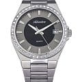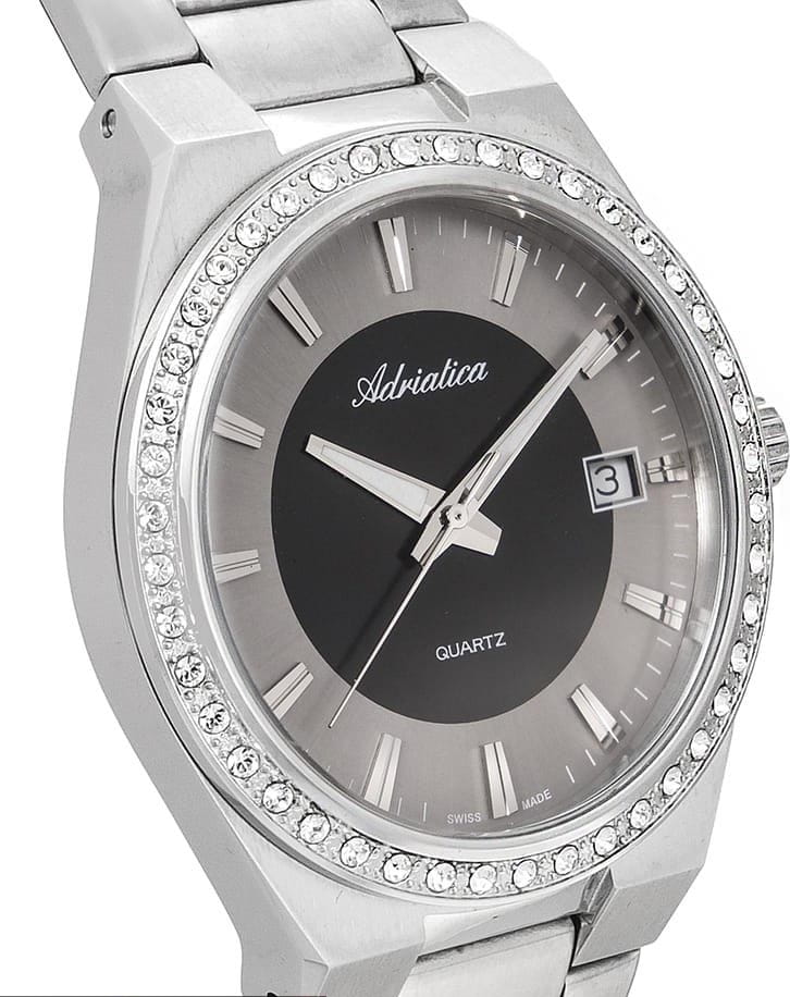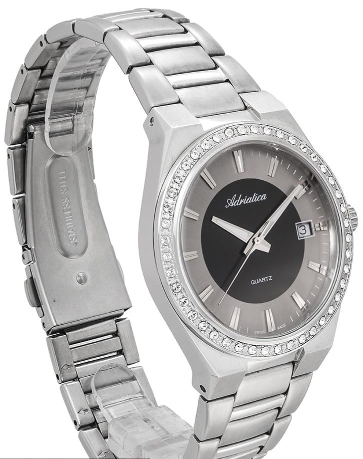 Женские швейцарские часы с минеральным стекломМинеральное стеклоМинеральное стекло представляет собой искусственно выращенный минерал кварца. Такое стекло отличается особой устойчивостью к повреждениям и царапинам. Уступает по некоторым качествам сапфировому стеклу. Adriatica A3804.5114QZ, кварцевый механизм, работающим от батарейки с высокой точностью. Класс водозащиты: 50 метров, позволит защитить корпус от случайных брызг или капель дождя. Корпус и браслет часов изготовлен из стали .Окошко даты находится в положении 3 часа.Стальной браслет на раскладной застёжкеРаскладная застёжкаТакой тип застёжки используется только на браслетах из металла. Она никогда не раскрывается полностью, происходит разделение на 2 и более частей. Раскладывающая застёжка снизит вероятность потери часов к минимуму.. Стрелки с люминесцентным покрытиемЛюминесцентное покрытиеПозволяет считывать показания времени в темноте. Производители наносят на стрелки, часовые индексы, безель или поверхность циферблата светонакопительный состав, дающий холодное свечение..БезельБезельВнешний ободок, закрепляющий стекло. В спортивных часах так называется поворотное кольцо с делениями на циферблате, выполняет роль таймера – замеряет отрезки времени на шкале. Неподвижный безель – элемент декора. Однонаправленно вращающийся безель на дайверских часах позволяет фиксировать моменты погружения и выныривания на поверхность.  инкрустирован цирконами.