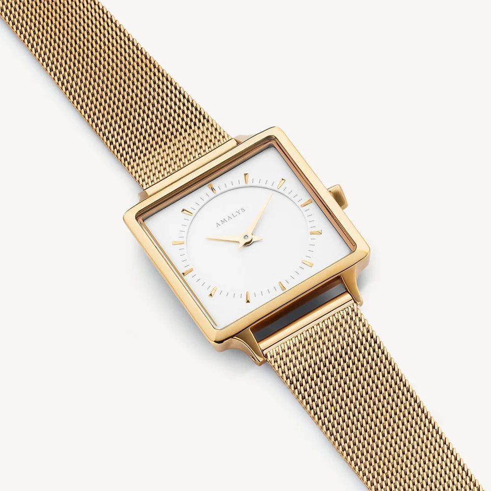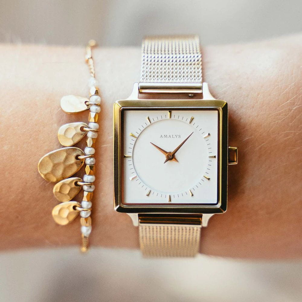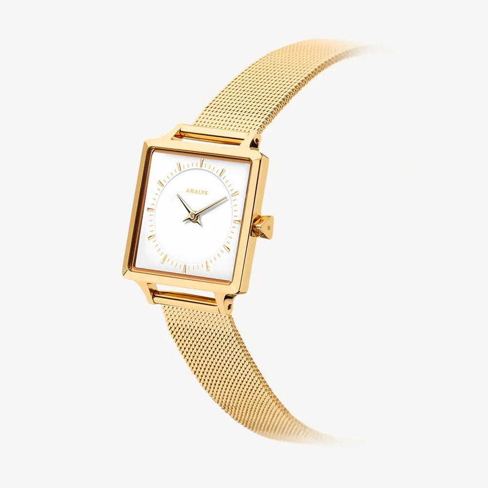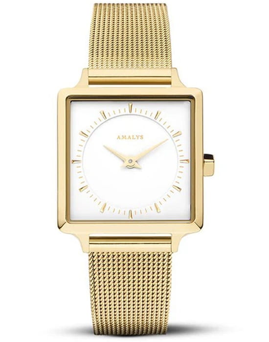 Amalys AMW-015 — женская модель с утончённой минималистичной эстетикой, где квадратный корпус с PVD-покрытиемPVDУльтратонкое покрытие наносится в технике вакуумного напыления, сочетает в себе нитрид титана особой прочности со слоем золота или оксида хрома. Несёт в себе декоративную или защитную функцию. размером 25 мм подчёркивает современный характер и чистоту линий. Механизм — точный кварцевый, обеспечивающий стабильный ход и надёжность в повседневном использовании. Поверхность циферблата оформлена в лаконичном стиле с тонкими метками и стрелками, создающими гармонию и визуальную лёгкость. Защитную функцию выполняет минеральное стеклоМинеральное стеклоМинеральное стекло представляет собой искусственно выращенный минерал кварца. Такое стекло отличается особой устойчивостью к повреждениям и царапинам. Уступает по некоторым качествам сапфировому стеклу., устойчивое к механическим воздействиям и сохраняющее читаемость при ежедневной носке. Браслет с PVD-покрытиемPVDУльтратонкое покрытие наносится в технике вакуумного напыления, сочетает в себе нитрид титана особой прочности со слоем золота или оксида хрома. Несёт в себе декоративную или защитную функцию. выполнен в виде «миланской сетки» шириной 14 мм, оснащён раскладным замкомРаскладной замокДанный вариант застежки используется только на часах с металлическим браслетом. Отличительная особенность такого крепления в том, что длина браслета становится универсальной и вы можете самостоятельно отрегулировать нужный вам размер – застежка просто двигается по браслету часов., его гибкая структура обеспечивает комфортное прилегание к запястью и визуальную утончённость. Единство корпуса и браслета создаёт целостный образ, а изысканная простота дизайна делает модель универсальной — она одинаково уместна и в деловой обстановке, и в повседневных сочетаниях.