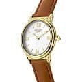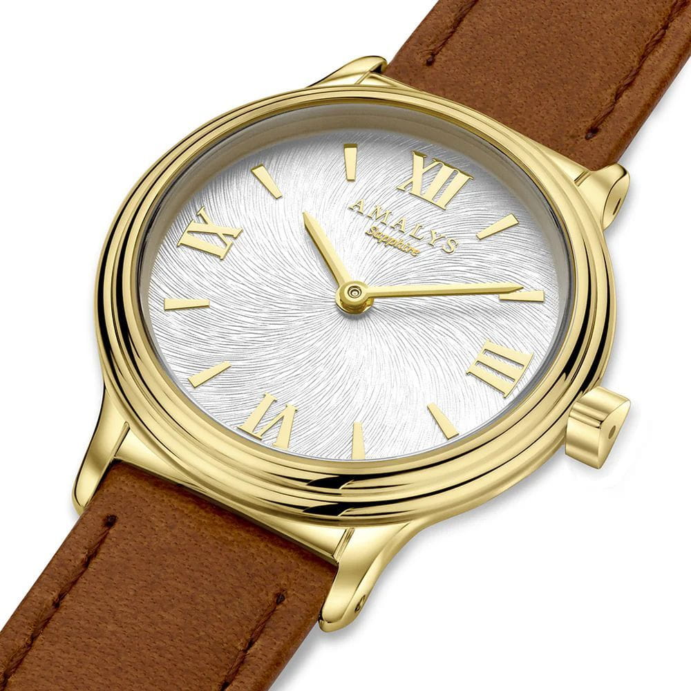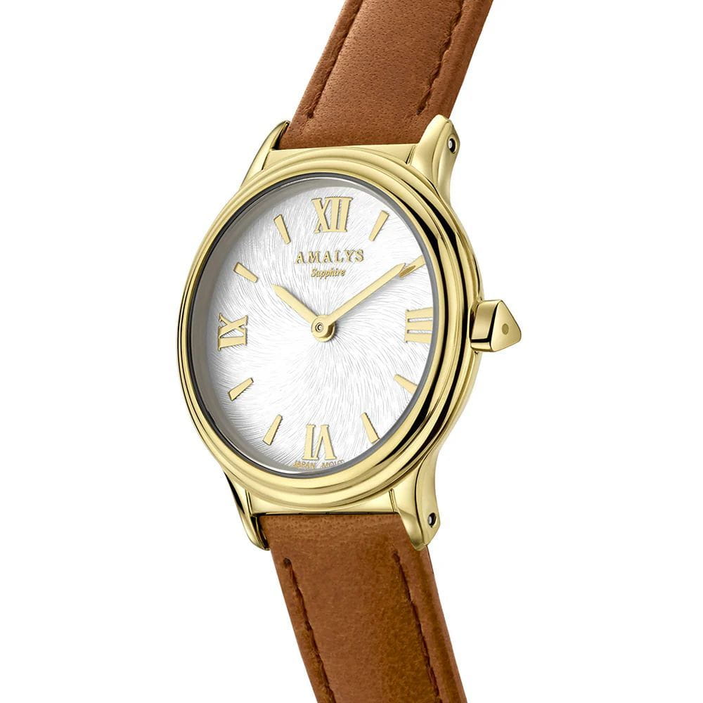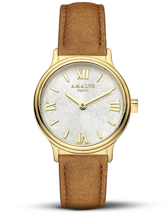 Amalys AMW-164 — женская модель с утончённым классическим дизайном, в которой сочетаются элегантность и практичность. Круглый корпус с PVD-покрытиемPVDУльтратонкое покрытие наносится в технике вакуумного напыления, сочетает в себе нитрид титана особой прочности со слоем золота или оксида хрома. Несёт в себе декоративную или защитную функцию. диаметром 28 мм выполнен из нержавеющей стали, гармонирующим с ремешком шириной 14 мм в том же исполнении. Защитную функцию выполняет сапфировое стеклоСапфировое стеклоПрочный и надёжный материал из кристалла сапфира синтетического происхождения, характеризующийся особой твёрдостью и устойчивостью к царапинам и повреждениям., стойкое к царапинам и сохраняющее прозрачность. Механизм — кварцевый, обеспечивающий точность и стабильность хода. Кожаный ремешок на стандартной застежке, который сочетает надёжность фиксации и удобство повседневного использования. Водозащита 5 ATM защищает часы от случайных брызг и дождя. Циферблат с римскими индексами и изящными стрелками подчёркивает классическую эстетику модели, делая её уместной как в повседневных образах, так и в торжественной обстановке.