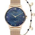 Amalys AMW-191 — женский набор, включающий часы и браслет, выполненный в едином элегантном стиле. Круглый корпус диаметром 33 мм изготовлен из нержавеющей стали с PVDPVDУльтратонкое покрытие наносится в технике вакуумного напыления, сочетает в себе нитрид титана особой прочности со слоем золота или оксида хрома. Несёт в себе декоративную или защитную функцию.-покрытием тёплого золотистого оттенка, что подчёркивает изысканный характер модели. Защитную функцию выполняет сапфировое стеклоСапфировое стеклоПрочный и надёжный материал из кристалла сапфира синтетического происхождения, характеризующийся особой твёрдостью и устойчивостью к царапинам и повреждениям., стойкое к царапинам и сохраняющее прозрачность. Механизм — кварцевый, обеспечивающий точность хода и удобство в использовании. Водозащита 3 ATM защищает от случайных брызг и дождя. Циферблат оформлен в минималистичном стиле с тонкими метками и изящными стрелками, подчёркивающими женственный образ. Стальной браслет миланского плетения с PVDPVDУльтратонкое покрытие наносится в технике вакуумного напыления, сочетает в себе нитрид титана особой прочности со слоем золота или оксида хрома. Несёт в себе декоративную или защитную функцию.-покрытием на раскладном замкеРаскладной замокДанный вариант застежки используется только на часах с металлическим браслетом. Отличительная особенность такого крепления в том, что длина браслета становится универсальной и вы можете самостоятельно отрегулировать нужный вам размер – застежка просто двигается по браслету часов. мягко облегает запястье и гармонично сочетается с корпусом. Дополняющий набор браслет усиливает впечатление цельности и придаёт образу завершённость.