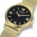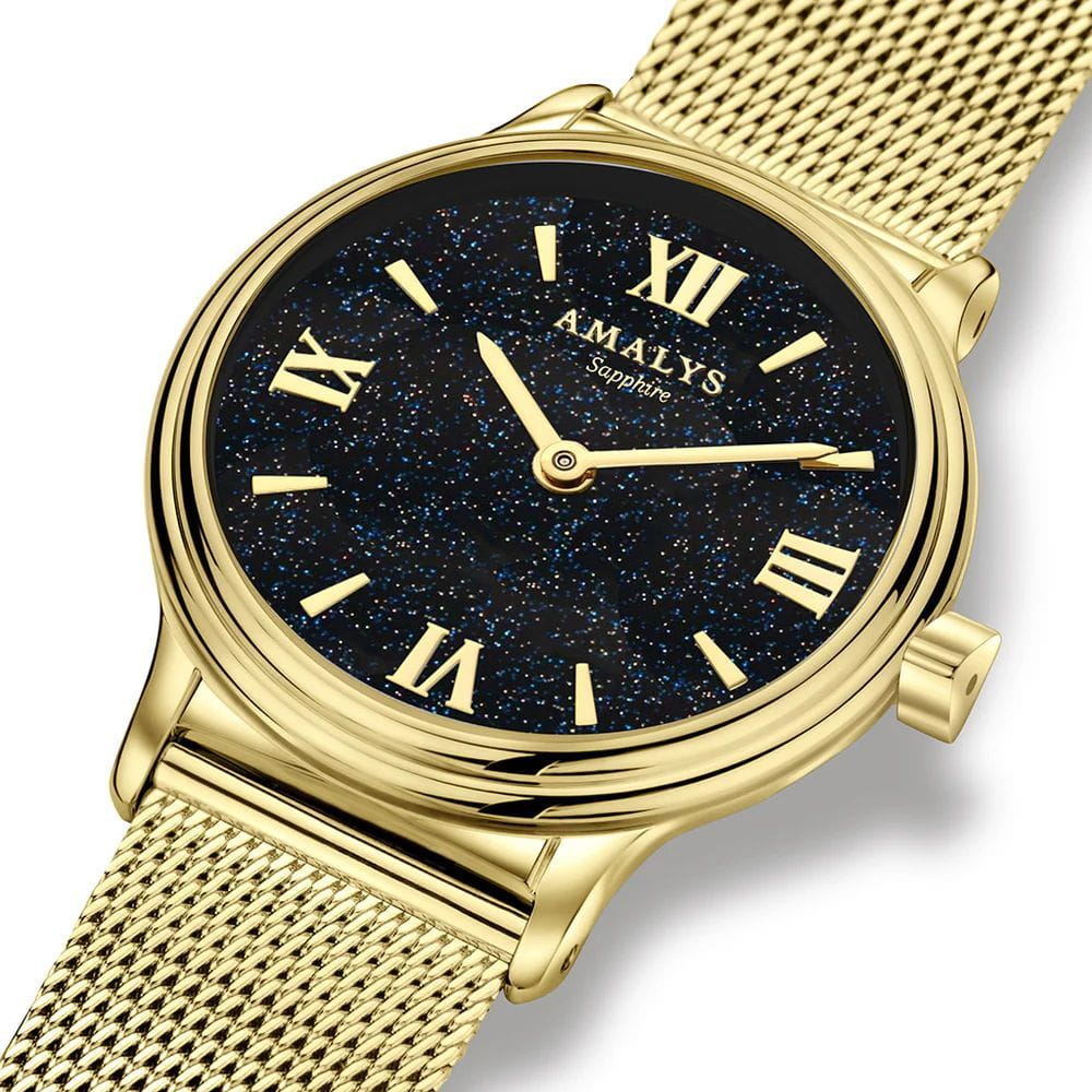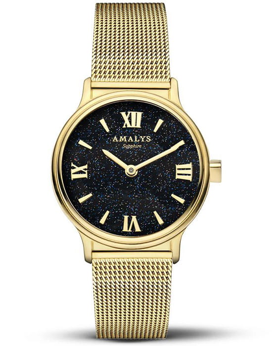 Amalys AMW-200 — женская модель с утончённым классическим дизайном, в которой сочетаются элегантность и практичность. Круглый корпус диаметром 28 мм выполнен из нержавеющей стали с PVD-покрытиемPVDУльтратонкое покрытие наносится в технике вакуумного напыления, сочетает в себе нитрид титана особой прочности со слоем золота или оксида хрома. Несёт в себе декоративную или защитную функцию., гармонирующим с браслетом шириной 14 мм в том же исполнении. Защитную функцию выполняет сапфировое стеклоСапфировое стеклоПрочный и надёжный материал из кристалла сапфира синтетического происхождения, характеризующийся особой твёрдостью и устойчивостью к царапинам и повреждениям., стойкое к царапинам и сохраняющее прозрачность. Механизм — кварцевый, обеспечивающий точность и стабильность хода. Браслет миланского плетения с PVD-покрытиемPVDУльтратонкое покрытие наносится в технике вакуумного напыления, сочетает в себе нитрид титана особой прочности со слоем золота или оксида хрома. Несёт в себе декоративную или защитную функцию. снабжён раскладным замкомРаскладной замокДанный вариант застежки используется только на часах с металлическим браслетом. Отличительная особенность такого крепления в том, что длина браслета становится универсальной и вы можете самостоятельно отрегулировать нужный вам размер – застежка просто двигается по браслету часов., который сочетает надёжность фиксации и удобство повседневного использования. Водозащита 5 ATM защищает часы от случайных брызг и дождя. Циферблат с римскими индексами и изящными стрелками подчёркивает классическую эстетику модели, делая её уместной как в повседневных образах, так и в торжественной обстановке.