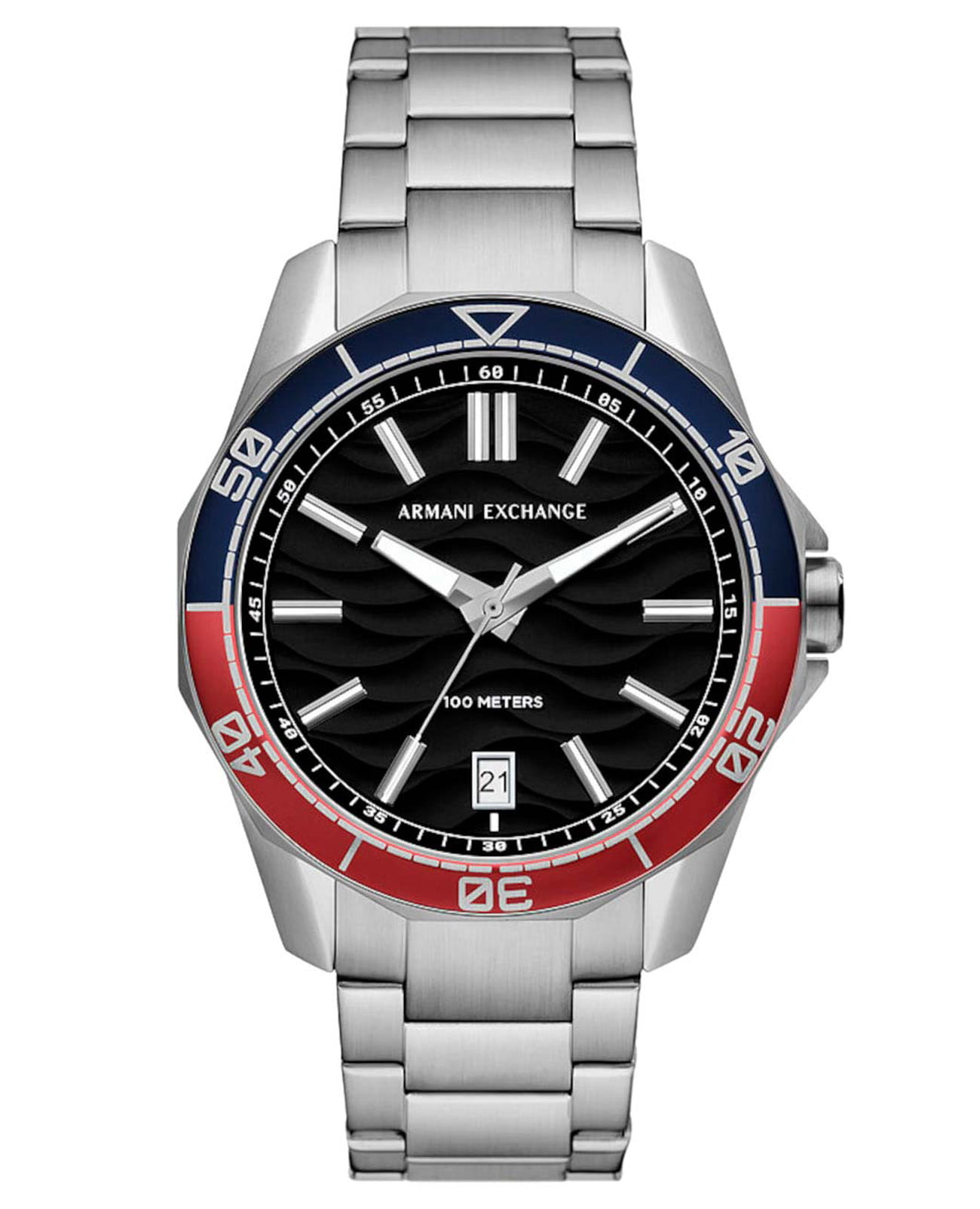 Мужские наручные часы с минеральным стекломМинеральное стеклоМинеральное стекло представляет собой искусственно выращенный минерал кварца. Такое стекло отличается особой устойчивостью к повреждениям и царапинам. Уступает по некоторым качествам сапфировому стеклу. Armani Exchange Dante AX1955, кварцевый механизм с высокой точностью. Класс водозащиты: 100 метров, позволит плавать, нырять и заниматься другими водными видами спорта. Корпус часов изготовлен из стали. Стальной браслет на раскладной застёжкеРаскладная застёжкаТакой тип застёжки используется только на браслетах из металла. Она никогда не раскрывается полностью, происходит разделение на 2 и более частей. Раскладывающая застёжка снизит вероятность потери часов к минимуму.. Вращающийся безельБезельВнешний ободок, закрепляющий стекло. В спортивных часах так называется поворотное кольцо с делениями на циферблате, выполняет роль таймера – замеряет отрезки времени на шкале. Неподвижный безель – элемент декора. Однонаправленно вращающийся безель на дайверских часах позволяет фиксировать моменты погружения и выныривания на поверхность. с IP-покрытиемIP-покрытиеМетод ионного напыления. Демонстрирует повышенную устойчивость к истиранию, окислению и химическим веществам. Под воздействием высокого давления и температуры около 1500°C молекулы металла надёжно соединяются с частицами корпуса часов.. Текстурированный циферблат с метками в виде штрихов. Окошко даты находится в положении 6 часов.
