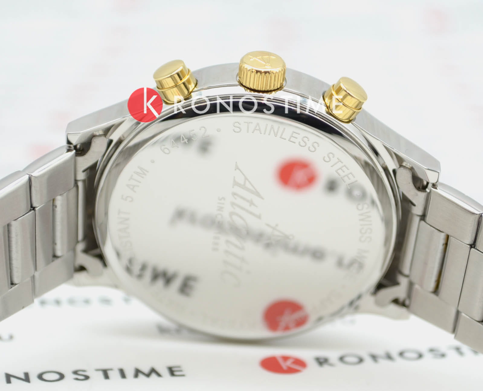 Мужские швейцарские часы-хронографХронографФункция позволяет измерять отрезки времени с особой точностью: часы, минуты, секунды. Верным признаком хронографа является наличие на циферблате 3 дополнительных окошек-счётчиков. с секундомеромСекундомерСекундоме́р — прибор, способный измерять интервалы времени с точностью до долей секунды. Atlantic Seabase 64457.43.58G, кварцевый механизм с высокой точностью. Cапфировое стеклоСапфировое стеклоПрочный и надёжный материал из кристалла сапфира синтетического происхождения, характеризующийся особой твёрдостью и устойчивостью к царапинам и повреждениям. устойчивое к появлению царапин и обладающее высокой прозрачностью. Корпус и браслет часов изготовлены из нержавеющей стали с частичным PVDPVDУльтратонкое покрытие наносится в технике вакуумного напыления, сочетает в себе нитрид титана особой прочности со слоем золота или оксида хрома. Несёт в себе декоративную или защитную функцию. покрытием. На циферблате расположены римские цифры, два дополнительных индикатора, окошко даты в положении 3 часов. Класс водозащиты: 50 метров, позволит защитить корпус от случайных брызг или капель дождя. Стальной браслет на раскладной застёжкеРаскладная застёжкаТакой тип застёжки используется только на браслетах из металла. Она никогда не раскрывается полностью, происходит разделение на 2 и более частей. Раскладывающая застёжка снизит вероятность потери часов к минимуму..