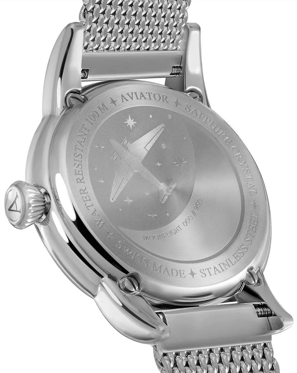 Aviator Douglas MoonFlight V.1.33.0.262.5— элегантные дамские швейцарские часы с утончённой авиационной эстетикой. Корпус 36 мм из нержавеющей стали 316L обладает компактными пропорциями и удобным профилем. Циферблат в стиле Art Deco украшает усложнение фаз Луны в верхней половине, обрамлённой тонким кольцом облаков. Отмечено окно даты в положении «6 часов». Стрелки обработаны люминесцентным покрытиемЛюминесцентное покрытиеПозволяет считывать показания времени в темноте. Производители наносят на стрелки, часовые индексы, безель или поверхность циферблата светонакопительный состав, дающий холодное свечение. Superluminova — для уверенного считывания в темноте. Поверхность защищена сапфировым стекломСапфировое стеклоПрочный и надёжный материал из кристалла сапфира синтетического происхождения, характеризующийся особой твёрдостью и устойчивостью к царапинам и повреждениям. с антибликовым покрытиемАнтибликовое покрытиеСлой оксида металла в 0,13-0,3 микрон, благодаря которому стекло часов не бликует и не отражает свет. Антибликовое покрытие уменьшает отражение света в 10 раз, обеспечивая отличную читаемость показателей циферблата.. Сердце модели — швейцарский кварцевый механизм Ronda 708 с функцией отображения лунных фаз, 13 рубинами и возможностью работать до 54 месяцев без замены батареи. Завинчивающаяся задняя крышка с гравировкой Douglas DC-3 и герметичность до 100 метров создают надёжную основу для эксплуатации. Стальной браслет миланского плетения на раскладном замкеРаскладной замокДанный вариант застежки используется только на часах с металлическим браслетом. Отличительная особенность такого крепления в том, что длина браслета становится универсальной и вы можете самостоятельно отрегулировать нужный вам размер – застежка просто двигается по браслету часов., сочетая комфорт, элегантность и практичность. Лимитированная серия - 950 экземпляров. Aviator Douglas MoonFlight — это гармоничное сочетание авиационного наследия, женской элегантности и технической изысканности, воплощённое в элегантном и функциональном аксессуаре.