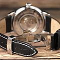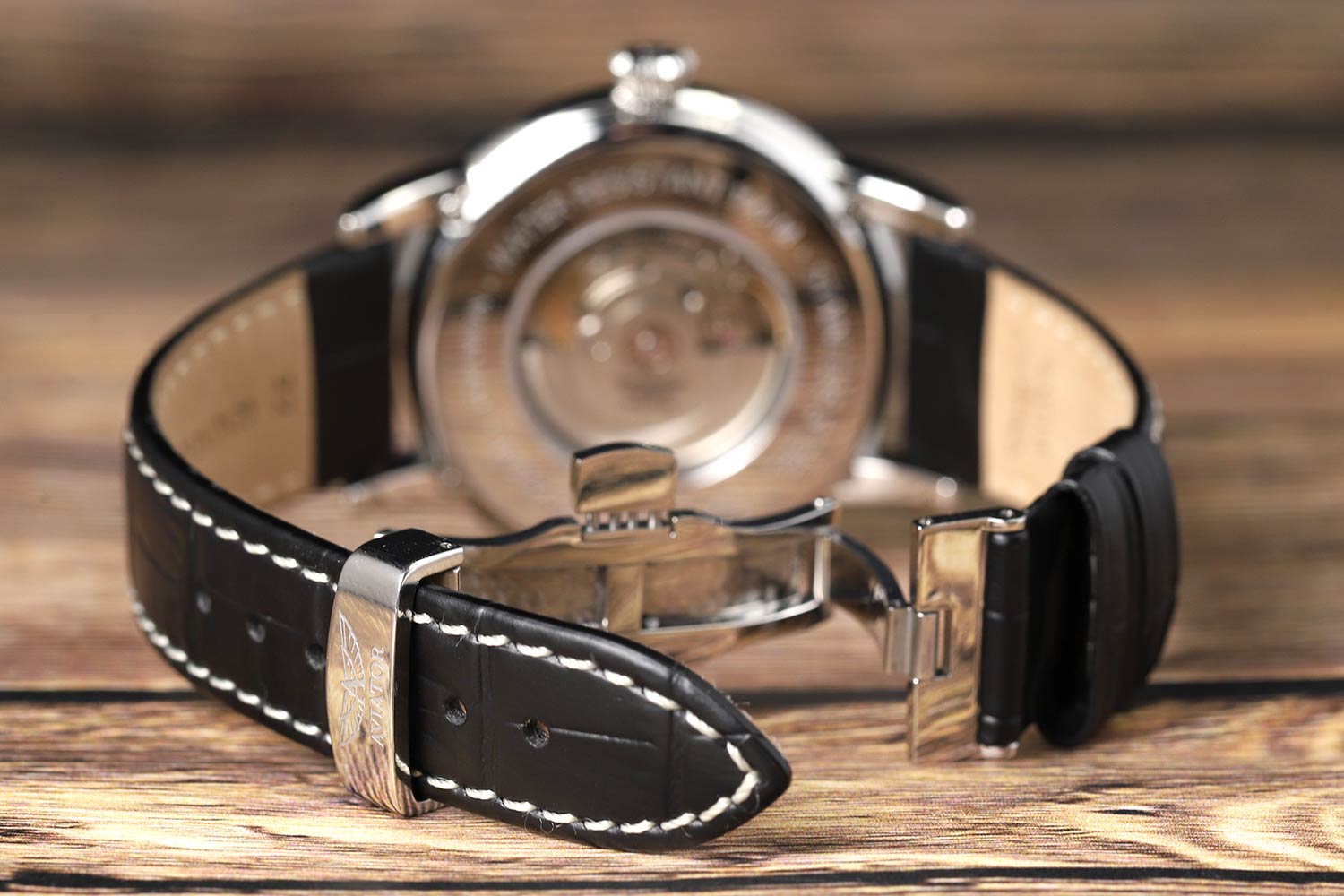 Модель дополнена кожаным ремешком, оснащённым надёжной раскладной застёжкойРаскладная застёжкаТакой тип застёжки используется только на браслетах из металла. Она никогда не раскрывается полностью, происходит разделение на 2 и более частей. Раскладывающая застёжка снизит вероятность потери часов к минимуму., а сам корпус защищён от внешних воздействий благодаря водонепроницаемости до 100 метров и ударопрочному корпусуУдаропрочный корпусМеханизм заключён в корпус, выполненный из современных материалов, устойчивых к ударам, механическим повреждениям и падению с высоты: инновационный пластик, карбон, нержавеющая сталь, титан..