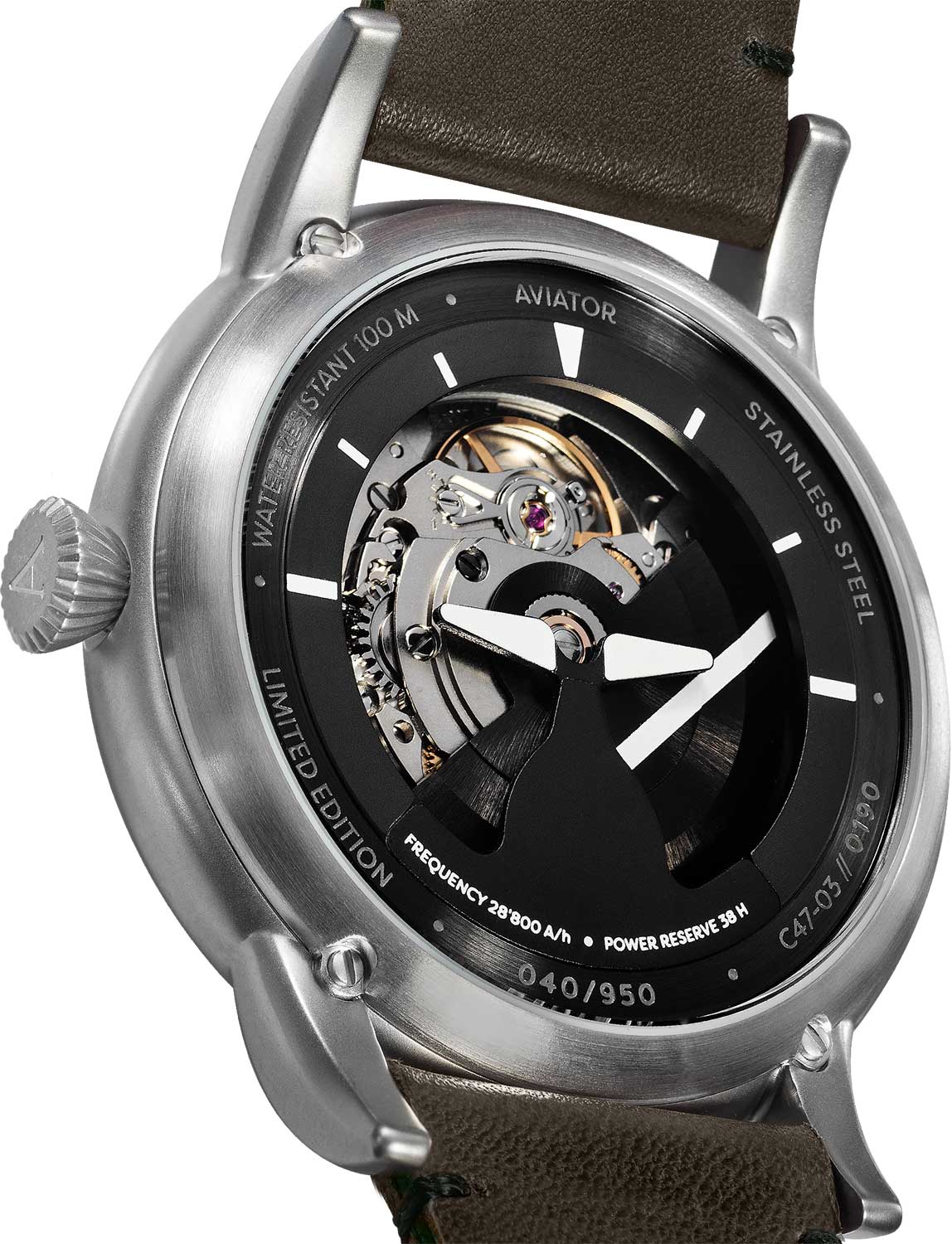 Aviator Douglas V.3.31.0.227.4 — швейцарские часы в классике авиадизайна, сочетающие безупречную читаемость и высокую надёжность. Лимитированная серия. Корпус диаметром 45 мм выполнен из нержавеющей стали с PVD-покрытиемPVDУльтратонкое покрытие наносится в технике вакуумного напыления, сочетает в себе нитрид титана особой прочности со слоем золота или оксида хрома. Несёт в себе декоративную или защитную функцию. серого цвета. Накладные метки выполнены в виде арабских цифр. Часовые метки и стрелки покрыты люминесцентным покрытиемЛюминесцентное покрытиеПозволяет считывать показания времени в темноте. Производители наносят на стрелки, часовые индексы, безель или поверхность циферблата светонакопительный состав, дающий холодное свечение. Superluminova, позволяющим легко определять время даже в тёмное время суток. Поверхность защищена прочным сапфировым стекломСапфировое стеклоПрочный и надёжный материал из кристалла сапфира синтетического происхождения, характеризующийся особой твёрдостью и устойчивостью к царапинам и повреждениям. с антибликовым покрытием, устойчивым к царапинам. Сердце модели — швейцарский механизм Sellita SW 200, известный своей точностью и долговечностью. Калибр управляется регулятором Etachron, который обеспечивает высокую точность хода как на земле, так и над землей. Водозащита 100 метров, позволит плавать, нырять и заниматься другими водными видами спорта. Завинчивающаяся головка и задняя крышка обеспечивают уверенную ударопрочностьУдаропрочный корпусМеханизм заключён в корпус, выполненный из современных материалов, устойчивых к ударам, механическим повреждениям и падению с высоты: инновационный пластик, карбон, нержавеющая сталь, титан. и надёжную защиту от влаги и пыли. В механизме 26 камней, запас хода 38 часов. Модель дополнена кожаным ремешком с выразительной текстурой и классическим стилем, закреплённым с помощью классической застежки — для максимального комфорта и лёгкости в повседневном использовании. Прозрачная задняя крышка украшена имитацией функции контроля управления хвоста самолета. Ротор механизма указывает на градусы, как в авиационном приборе триммер. Aviator — это образец лётной точности, инженерной чёткости и сдержанной роскоши, идеально подходящий для тех, кто ценит функциональность и уверенность в каждом элементе.