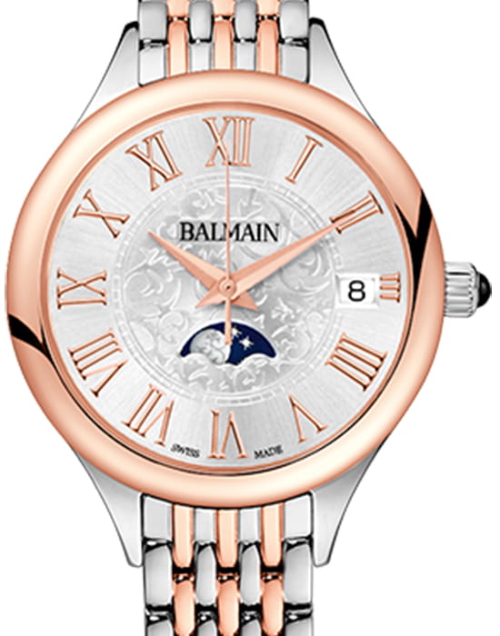 Женские часы Balmain de Balmain B4918.33.12 кварцевый механизм с высокой точностью. Сапфировое стеклоСапфировое стеклоПрочный и надёжный материал из кристалла сапфира синтетического происхождения, характеризующийся особой твёрдостью и устойчивостью к царапинам и повреждениям. устойчивое к появлению царапин, обладающее высокой прозрачностью. Корпус изготовлен из нержавеющей стали. Класс водозащиты: 50 метров, позволит защитить корпус от случайных брызг или капель дождя. Стальной браслет с частичным PVD-покрытиемPVDУльтратонкое покрытие наносится в технике вакуумного напыления, сочетает в себе нитрид титана особой прочности со слоем золота или оксида хрома. Несёт в себе декоративную или защитную функцию.. на застёжке «бабочка» с кнопкамиЗастёжка "бабочка"Такой вид застёжки дополняется предохранителями, помогающими избежать случайного раскрытия браслета. Обладают изящным исполнением. . БезельБезельВнешний ободок, закрепляющий стекло. В спортивных часах так называется поворотное кольцо с делениями на циферблате, выполняет роль таймера – замеряет отрезки времени на шкале. Неподвижный безель – элемент декора. Однонаправленно вращающийся безель на дайверских часах позволяет фиксировать моменты погружения и выныривания на поверхность. с PVD-покрытиемPVDУльтратонкое покрытие наносится в технике вакуумного напыления, сочетает в себе нитрид титана особой прочности со слоем золота или оксида хрома. Несёт в себе декоративную или защитную функцию.. Лунный календарь в позиции 6 часов.