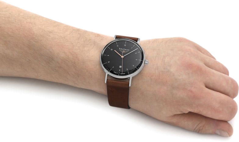 Мужские кварцевые часы Bauhaus — это аксессуар с классическим дизайном, вдохновлённым принципами ар-деко и минимализма. Корпус диаметром 41 мм и толщиной 10 мм выполнен из стали с полированной поверхностью. Циферблат чёрного цвета оформлен арабскими цифрами и узкими прямоугольными стрелками в стиле Baton. Окошко даты расположено в положении 6 часов. Циферблат защищён прочным минеральным стекломМинеральное стеклоМинеральное стекло представляет собой искусственно выращенный минерал кварца. Такое стекло отличается особой устойчивостью к повреждениям и царапинам. Уступает по некоторым качествам сапфировому стеклу. K1. Механизм — швейцарский кварцевый калибр Ronda 505. Часы оснащены кожаным ремешком с тиснением Bauhaus и классической пряжкой. Водонепроницаемость 50 м позволяет использовать часы в повседневных условиях. Идеальный выбор для тех, кто ценит немецкое качество и элегантность.