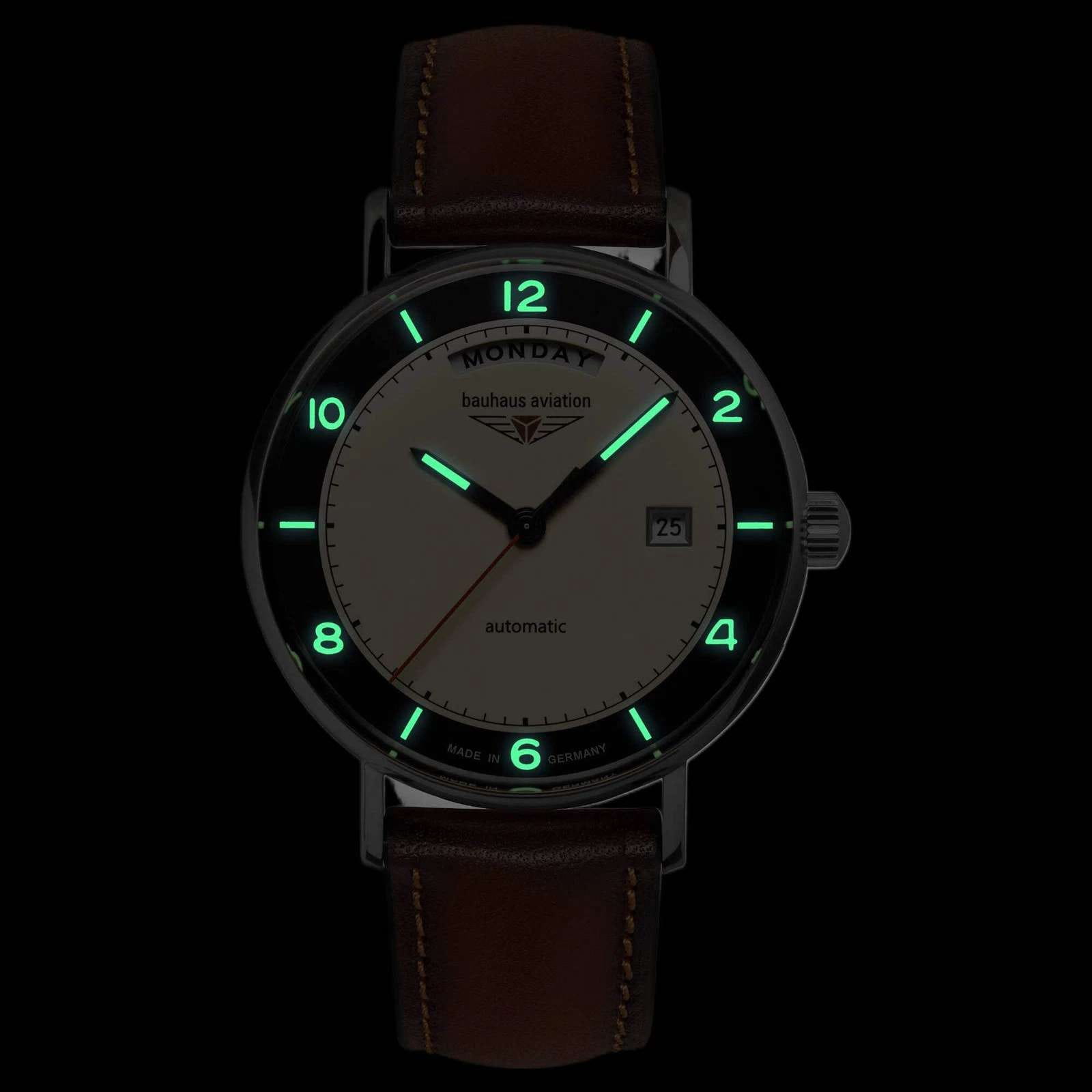 Мужские механические часы с автоподзаводом Bauhaus — это аксессуар с винтажным пилотским стилем. Корпус диаметром 41 мм и толщиной 12 мм выполнен из нержавеющей стали. Циферблат бежевого цвета оформлен арабскими цифрами и стрелками. Окошко даты расположено в положении 3 часов. Стрелки и метки с люминесцентным покрытиемЛюминесцентное покрытиеПозволяет считывать показания времени в темноте. Производители наносят на стрелки, часовые индексы, безель или поверхность циферблата светонакопительный состав, дающий холодное свечение., обеспечивающим хорошую читаемость в темноте. Циферблат защищён прочным минеральным стекломМинеральное стеклоМинеральное стекло представляет собой искусственно выращенный минерал кварца. Такое стекло отличается особой устойчивостью к повреждениям и царапинам. Уступает по некоторым качествам сапфировому стеклу. K1. Часы оснащены коричневым кожаным ремешком на классической пряжке. Водонепроницаемость 50 м позволяет использовать часы в повседневных условиях. Идеальный выбор для тех, кто ценит немецкое качество и ретро-стиль.
