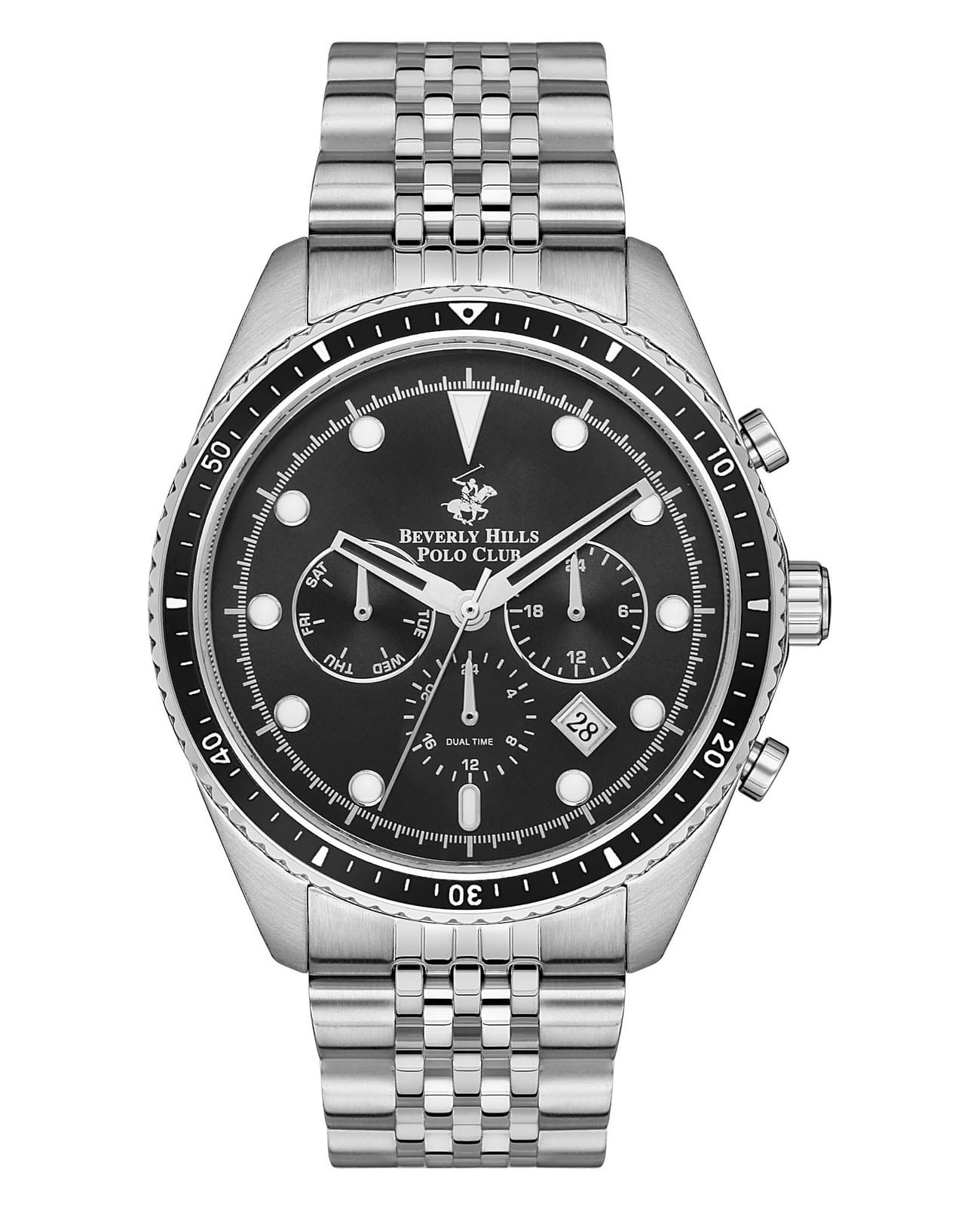 Американские мужские часы с минеральным стекломМинеральное стеклоМинеральное стекло представляет собой искусственно выращенный минерал кварца. Такое стекло отличается особой устойчивостью к повреждениям и царапинам. Уступает по некоторым качествам сапфировому стеклу. Beverly Hills Polo Club BP3354X.350, кварцевый механизм с высокой точностью. Циферблат с люминесцентным покрытиемЛюминесцентное покрытиеПозволяет считывать показания времени в темноте. Производители наносят на стрелки, часовые индексы, безель или поверхность циферблата светонакопительный состав, дающий холодное свечение. стрелок и меток. Класс водозащиты: 50 метров, позволит защитить корпус от случайных брызг или капель дождя. Корпус изготовлен из нержавеющей стали, безельБезельВнешний ободок, закрепляющий стекло. В спортивных часах так называется поворотное кольцо с делениями на циферблате, выполняет роль таймера – замеряет отрезки времени на шкале. Неподвижный безель – элемент декора. Однонаправленно вращающийся безель на дайверских часах позволяет фиксировать моменты погружения и выныривания на поверхность. с IP-покрытиемIP-покрытиеМетод ионного напыления. Демонстрирует повышенную устойчивость к истиранию, окислению и химическим веществам. Под воздействием высокого давления и температуры около 1500°C молекулы металла надёжно соединяются с частицами корпуса часов.. Браслет с раскладной застёжкойРаскладная застёжкаТакой тип застёжки используется только на браслетах из металла. Она никогда не раскрывается полностью, происходит разделение на 2 и более частей. Раскладывающая застёжка снизит вероятность потери часов к минимуму..