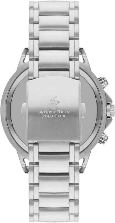 Американские мужские часы Beverly Hills Polo Club BP3401X.350 с минеральным стекломМинеральное стеклоМинеральное стекло представляет собой искусственно выращенный минерал кварца. Такое стекло отличается особой устойчивостью к повреждениям и царапинам. Уступает по некоторым качествам сапфировому стеклу., кварцевый механизм с высокой точностью. Класс водозащиты: 100 метров, позволит защитить корпус от случайных брызг или капель дождя. Корпус часов изготовлен из стали. Стальной браслет с раскладной застёжкойРаскладная застёжкаТакой тип застёжки используется только на браслетах из металла. Она никогда не раскрывается полностью, происходит разделение на 2 и более частей. Раскладывающая застёжка снизит вероятность потери часов к минимуму.. Стрелки и метки с люминесцентным покрытиемЛюминесцентное покрытиеПозволяет считывать показания времени в темноте. Производители наносят на стрелки, часовые индексы, безель или поверхность циферблата светонакопительный состав, дающий холодное свечение.. Второй часовой поясВторой часовой поясФункция, позволяющая отображать время двух часовых поясов одновременно..