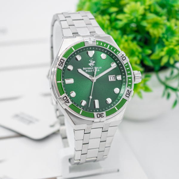 Американские мужские часы Beverly Hills Polo Club BP3404X.370 с минеральным стекломМинеральное стеклоМинеральное стекло представляет собой искусственно выращенный минерал кварца. Такое стекло отличается особой устойчивостью к повреждениям и царапинам. Уступает по некоторым качествам сапфировому стеклу., кварцевый механизм с высокой точностью. Класс водозащиты: 100 метров, позволит защитить корпус от случайных брызг или капель дождя. Корпус часов изготовлен из стали. Стальной браслет с раскладной застёжкойРаскладная застёжкаТакой тип застёжки используется только на браслетах из металла. Она никогда не раскрывается полностью, происходит разделение на 2 и более частей. Раскладывающая застёжка снизит вероятность потери часов к минимуму.. Стрелки и метки с люминесцентным покрытиемЛюминесцентное покрытиеПозволяет считывать показания времени в темноте. Производители наносят на стрелки, часовые индексы, безель или поверхность циферблата светонакопительный состав, дающий холодное свечение.. Окошко даты находится в положении 3 часа. БезельБезельВнешний ободок, закрепляющий стекло. В спортивных часах так называется поворотное кольцо с делениями на циферблате, выполняет роль таймера – замеряет отрезки времени на шкале. Неподвижный безель – элемент декора. Однонаправленно вращающийся безель на дайверских часах позволяет фиксировать моменты погружения и выныривания на поверхность. с PVD-покрытиемPVDУльтратонкое покрытие наносится в технике вакуумного напыления, сочетает в себе нитрид титана особой прочности со слоем золота или оксида хрома. Несёт в себе декоративную или защитную функцию..