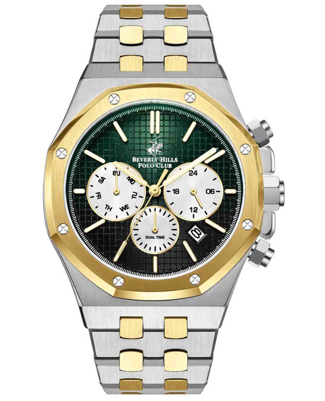 Beverly Hills Polo Club BP3051X.270 — выразительная модель с подчёркнуто мужским характером, в элегантном золотистом оттенке и строгих геометриях корпуса. Корпус диаметром около 42 мм из нержавеющей стали безельБезельВнешний ободок, закрепляющий стекло. В спортивных часах так называется поворотное кольцо с делениями на циферблате, выполняет роль таймера – замеряет отрезки времени на шкале. Неподвижный безель – элемент декора. Однонаправленно вращающийся безель на дайверских часах позволяет фиксировать моменты погружения и выныривания на поверхность. с IP-покрытияIP-покрытиеМетод ионного напыления. Демонстрирует повышенную устойчивость к истиранию, окислению и химическим веществам. Под воздействием высокого давления и температуры около 1500°C молекулы металла надёжно соединяются с частицами корпуса часов. оформлен в современной октагональной форме, вызывая ассоциации с принципиальным архитектурным стилем.