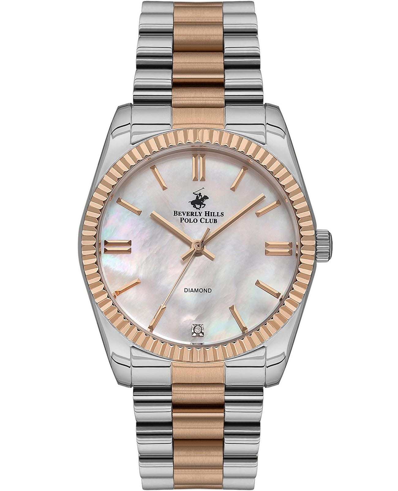 Женские часы Beverly Hills Polo BP3172C.520 с надёжным кварцевым механизмом. Минеральное стеклоМинеральное стеклоМинеральное стекло представляет собой искусственно выращенный минерал кварца. Такое стекло отличается особой устойчивостью к повреждениям и царапинам. Уступает по некоторым качествам сапфировому стеклу. устойчивое к появлению царапин, обладающее высокой прозрачностью. Класс водозащиты: 30 метров, позволит защитить корпус от случайных брызг или капель дождя. Корпус часов изготовлен из стали. Стальной браслет с частичным IP-покрытиемIP-покрытиеМетод ионного напыления. Демонстрирует повышенную устойчивость к истиранию, окислению и химическим веществам. Под воздействием высокого давления и температуры около 1500°C молекулы металла надёжно соединяются с частицами корпуса часов. на раскладной застёжкеРаскладная застёжкаТакой тип застёжки используется только на браслетах из металла. Она никогда не раскрывается полностью, происходит разделение на 2 и более частей. Раскладывающая застёжка снизит вероятность потери часов к минимуму.. БезельБезельВнешний ободок, закрепляющий стекло. В спортивных часах так называется поворотное кольцо с делениями на циферблате, выполняет роль таймера – замеряет отрезки времени на шкале. Неподвижный безель – элемент декора. Однонаправленно вращающийся безель на дайверских часах позволяет фиксировать моменты погружения и выныривания на поверхность. с IP-покрытиемIP-покрытиеМетод ионного напыления. Демонстрирует повышенную устойчивость к истиранию, окислению и химическим веществам. Под воздействием высокого давления и температуры около 1500°C молекулы металла надёжно соединяются с частицами корпуса часов.. Циферблат инкрустирован бриллиантом.