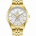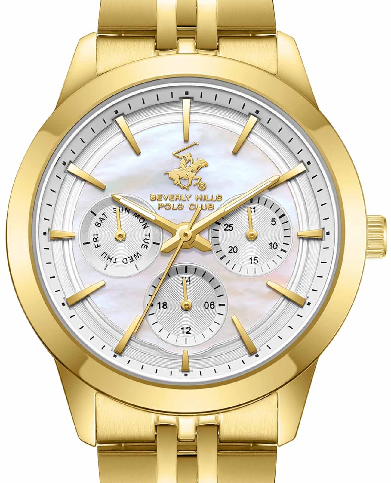 Beverly Hills Polo Club BP3705C.120 – элегантные женские часы, сочетающие стильный дизайн и высокую функциональность. Корпус диаметром 36 мм выполнен из суперметалла с PVD-покрытиемPVDУльтратонкое покрытие наносится в технике вакуумного напыления, сочетает в себе нитрид титана особой прочности со слоем золота или оксида хрома. Несёт в себе декоративную или защитную функцию., обеспечивающего прочность и долговечность. Циферблат украшен, и защищён минеральным стекломМинеральное стеклоМинеральное стекло представляет собой искусственно выращенный минерал кварца. Такое стекло отличается особой устойчивостью к повреждениям и царапинам. Уступает по некоторым качествам сапфировому стеклу., устойчивым к царапинам. Часы оснащены точным кварцевым механизмом, гарантирующим надёжное отображение времени. Браслет из нержавеющей стали с PVD-покрытиемPVDУльтратонкое покрытие наносится в технике вакуумного напыления, сочетает в себе нитрид титана особой прочности со слоем золота или оксида хрома. Несёт в себе декоративную или защитную функцию. на раскладной застёжкеРаскладная застёжкаТакой тип застёжки используется только на браслетах из металла. Она никогда не раскрывается полностью, происходит разделение на 2 и более частей. Раскладывающая застёжка снизит вероятность потери часов к минимуму., обеспечивающей комфортное ношение и надёжную фиксацию на запястье. Водозащита до 50 метров (5 ATM) позволяет использовать часы в повседневной жизни, включая кратковременное погружение в воду.