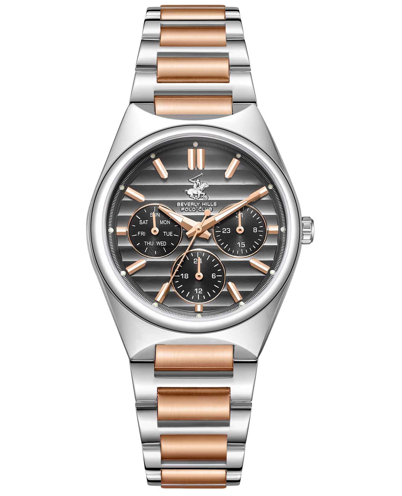 Beverly Hills Polo Club BP3746C.360 – элегантные женские часы, сочетающие стильный дизайн и высокую функциональность. Корпус диаметром 34 мм выполнен из суперметалла, обеспечивающего прочность и долговечность. Циферблат украшен, и защищён минеральным стекломМинеральное стеклоМинеральное стекло представляет собой искусственно выращенный минерал кварца. Такое стекло отличается особой устойчивостью к повреждениям и царапинам. Уступает по некоторым качествам сапфировому стеклу., устойчивым к царапинам. Часы оснащены точным кварцевым механизмом, гарантирующим надёжное отображение времени. Браслет из нержавеющей стали с PVD-покрытиемPVDУльтратонкое покрытие наносится в технике вакуумного напыления, сочетает в себе нитрид титана особой прочности со слоем золота или оксида хрома. Несёт в себе декоративную или защитную функцию. на застёжке-бабочке с кнопкамиЗастёжка "бабочка"Такой вид застёжки дополняется предохранителями, помогающими избежать случайного раскрытия браслета. Обладают изящным исполнением. , обеспечивающей комфортное ношение и надёжную фиксацию на запястье. Водозащита до 50 метров (5 ATM) позволяет использовать часы в повседневной жизни, включая кратковременное погружение в воду.