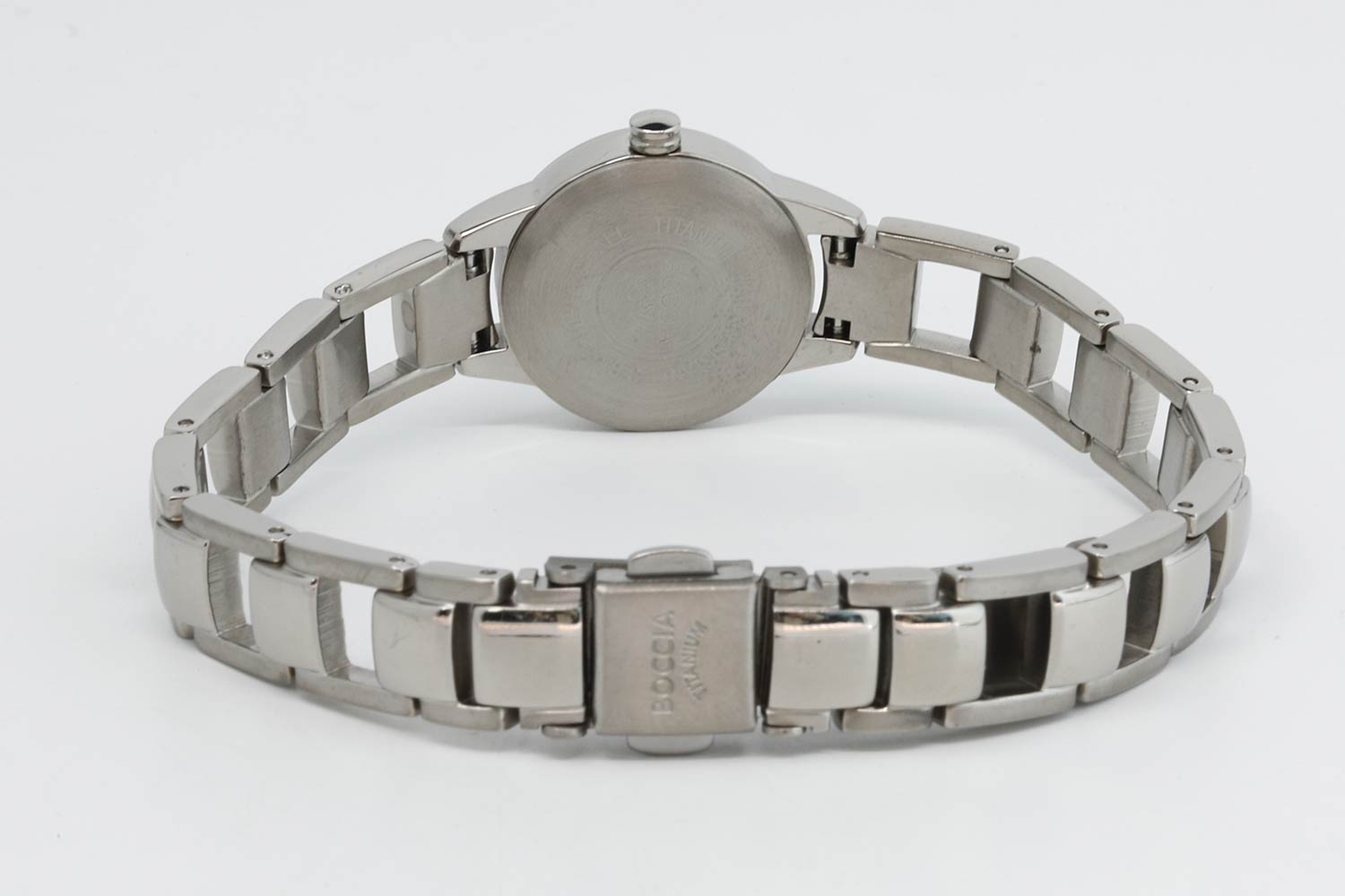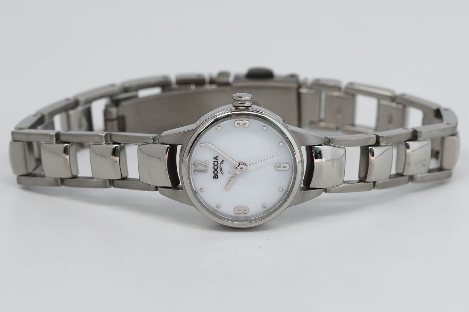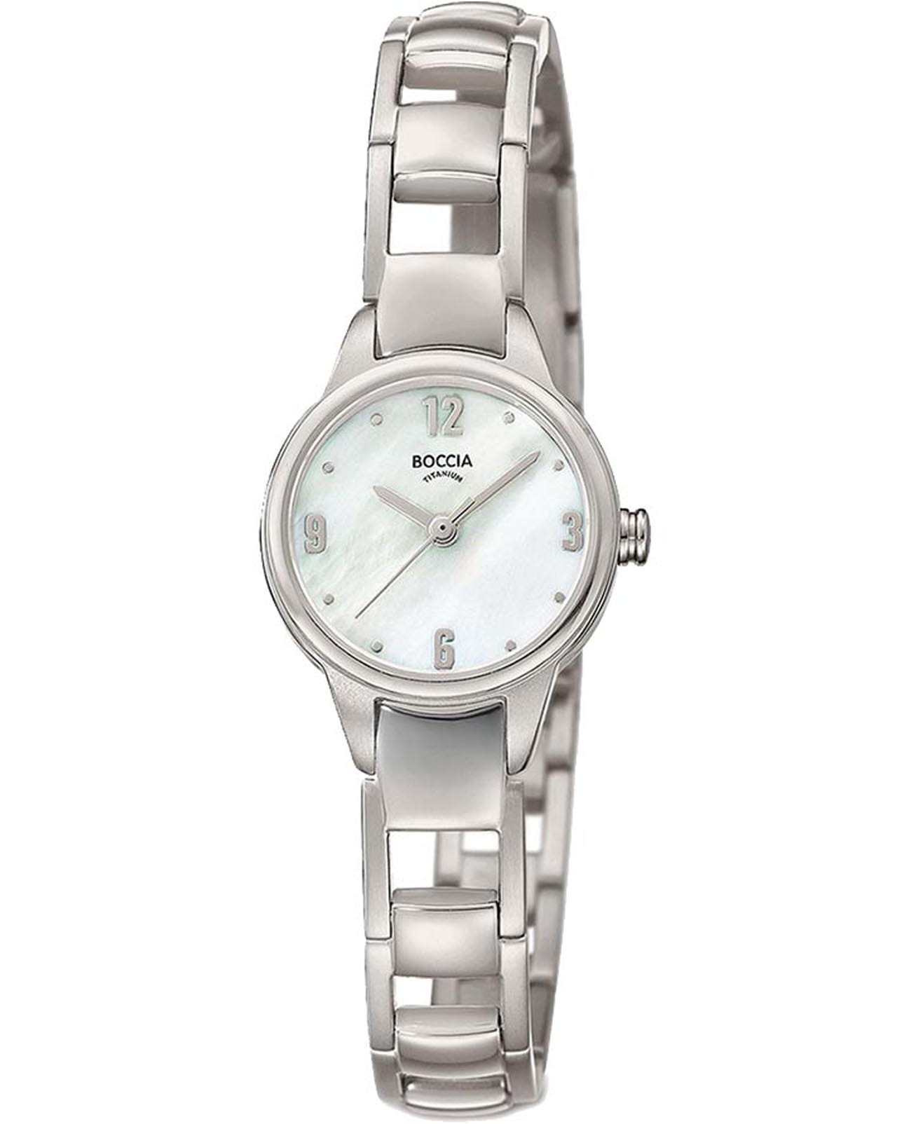 Женские наручные часы Boccia Titanium 3277-01 с надёжным кварцевым механизмом. Корпус и браслет часов изготовлены из титана. Минеральное стеклоМинеральное стеклоМинеральное стекло представляет собой искусственно выращенный минерал кварца. Такое стекло отличается особой устойчивостью к повреждениям и царапинам. Уступает по некоторым качествам сапфировому стеклу. устойчивое к мелким механическим повреждениям. Класс водозащиты: 30 метров, позволит защитить корпус от случайных брызг или капель дождя. Стрелки с люминесцентным покрытиемЛюминесцентное покрытиеПозволяет считывать показания времени в темноте. Производители наносят на стрелки, часовые индексы, безель или поверхность циферблата светонакопительный состав, дающий холодное свечение.. Титановый браслет на раскладной застёжкеРаскладная застёжкаТакой тип застёжки используется только на браслетах из металла. Она никогда не раскрывается полностью, происходит разделение на 2 и более частей. Раскладывающая застёжка снизит вероятность потери часов к минимуму..