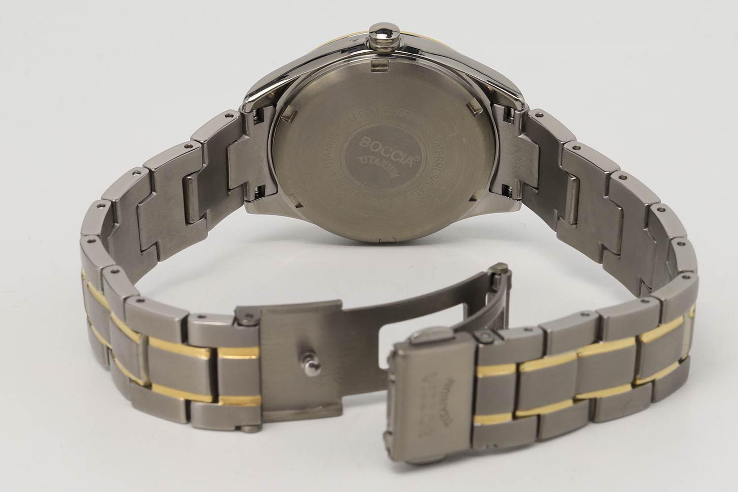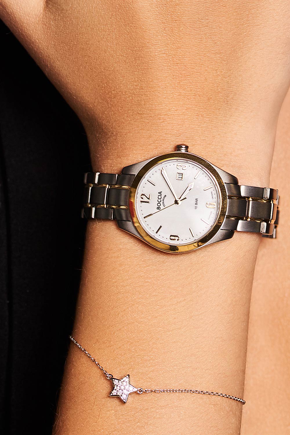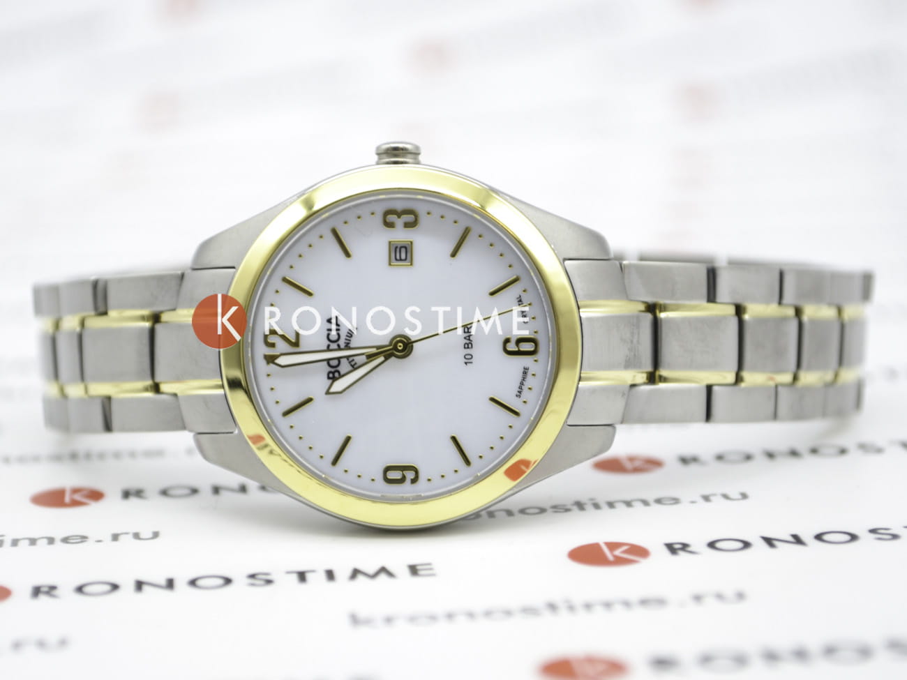 Женские наручные часы Boccia Titanium 3317-03 с надёжным кварцевым механизмом. Корпус и браслет часов изготовлены из титана. Сапфировое стеклоСапфировое стеклоПрочный и надёжный материал из кристалла сапфира синтетического происхождения, характеризующийся особой твёрдостью и устойчивостью к царапинам и повреждениям. устойчивое к мелким механическим повреждениям. Класс водозащиты: 100 метров, позволит плавать, нырять и заниматься другими водными видами спорта. Титановый браслет с частичным PVD-покрытиемPVDУльтратонкое покрытие наносится в технике вакуумного напыления, сочетает в себе нитрид титана особой прочности со слоем золота или оксида хрома. Несёт в себе декоративную или защитную функцию. на раскладной застёжкеРаскладная застёжкаТакой тип застёжки используется только на браслетах из металла. Она никогда не раскрывается полностью, происходит разделение на 2 и более частей. Раскладывающая застёжка снизит вероятность потери часов к минимуму.. Окошко даты находится в положении 3 часа. Стрелки с люминесцентным покрытиемЛюминесцентное покрытиеПозволяет считывать показания времени в темноте. Производители наносят на стрелки, часовые индексы, безель или поверхность циферблата светонакопительный состав, дающий холодное свечение..