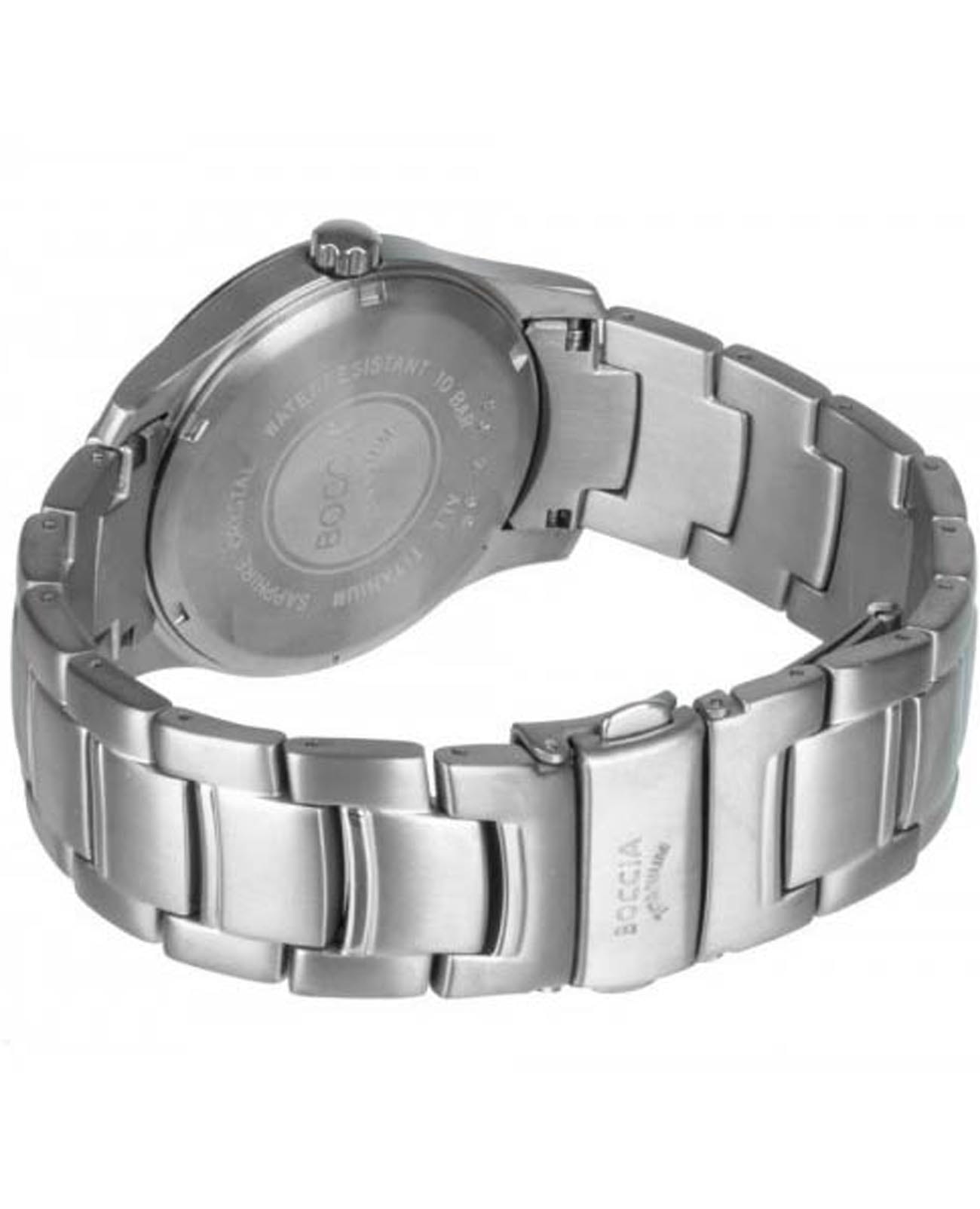 Мужские наручные часы Boccia Titanium 3626-03 с надёжным кварцевым механизмом. Корпус и браслет часов изготовлены из титана. Сапфировое стеклоСапфировое стеклоПрочный и надёжный материал из кристалла сапфира синтетического происхождения, характеризующийся особой твёрдостью и устойчивостью к царапинам и повреждениям. устойчивое к мелким механическим повреждениям. Класс водозащиты: 100 метров, позволит плавать, нырять и заниматься другими водными видами спорта. Окошко даты в положении 3 часа. Титановый браслет на раскладной застёжкеРаскладная застёжкаТакой тип застёжки используется только на браслетах из металла. Она никогда не раскрывается полностью, происходит разделение на 2 и более частей. Раскладывающая застёжка снизит вероятность потери часов к минимуму.. Стрелки и метки с люминесцентным покрытиемЛюминесцентное покрытиеПозволяет считывать показания времени в темноте. Производители наносят на стрелки, часовые индексы, безель или поверхность циферблата светонакопительный состав, дающий холодное свечение..
