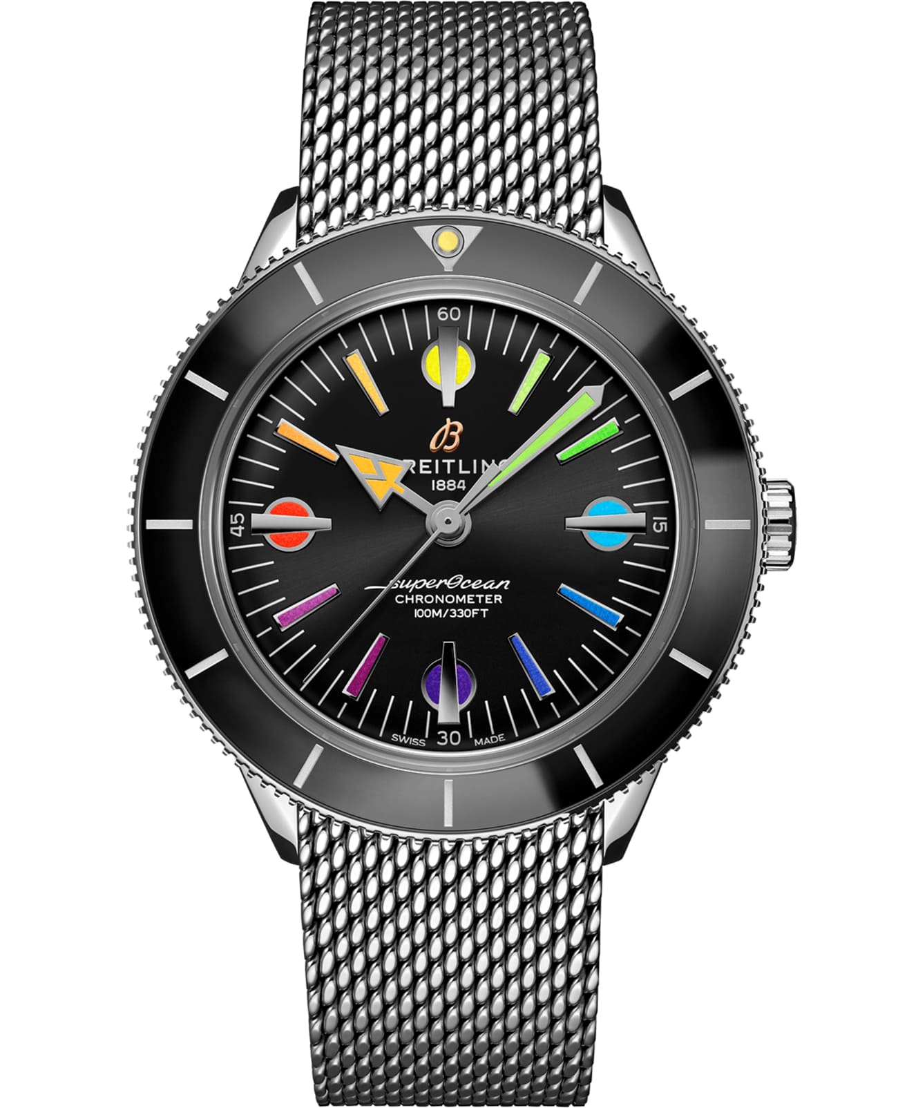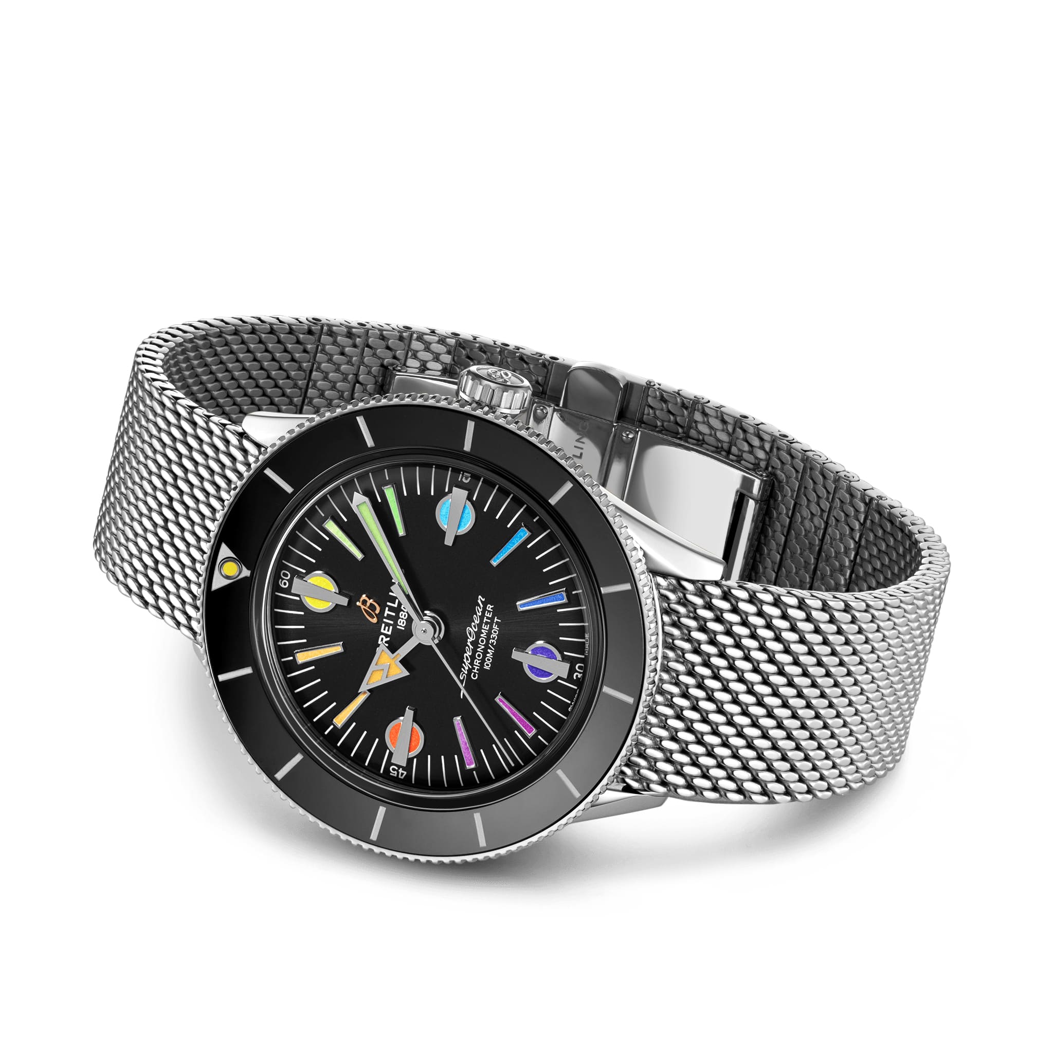 Эта яркая модель представлена лимитированной серией из 1000 экземпляров. Как и оригинальные SuperOcean, новые часы имеют две характерные особенности: на 42-миллиметровом корпусе из нержавеющей стали установлен вращающийся в оба направления вогнутый керамический безель, а на циферблате выделяются крупные метки.