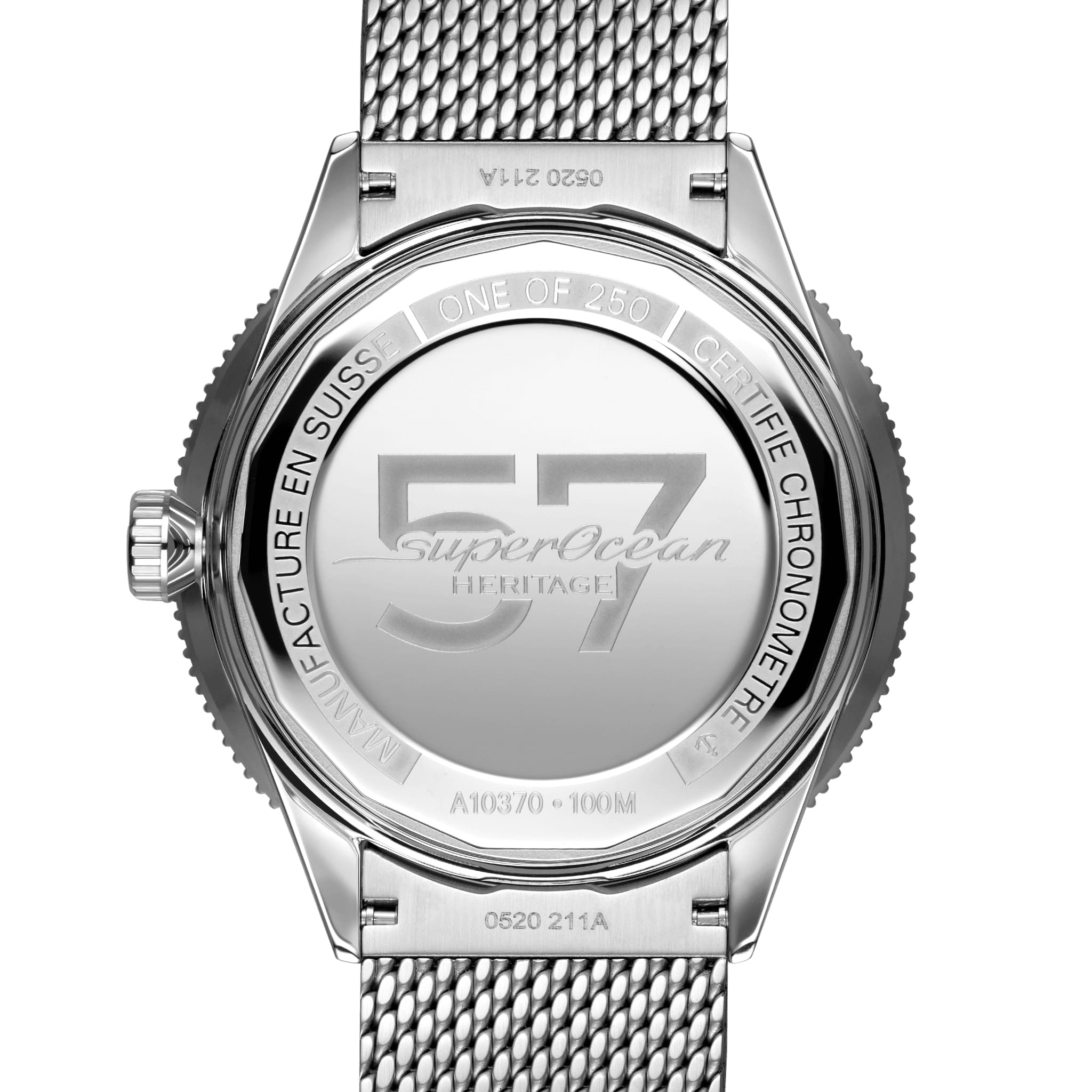 Часы Superocean Heritage ’57 предлагаются в комплекте с плетеным браслетом или ремешком из телячьей кожи золотисто-коричневого цвета с классической или раскладной застежкой из нержавеющей стали. Внутри корпуса размещен мануфактурный калибр Breitling Caliber 10, сертифицированный Швейцарским институтом официального тестирования хронометров (COSC).