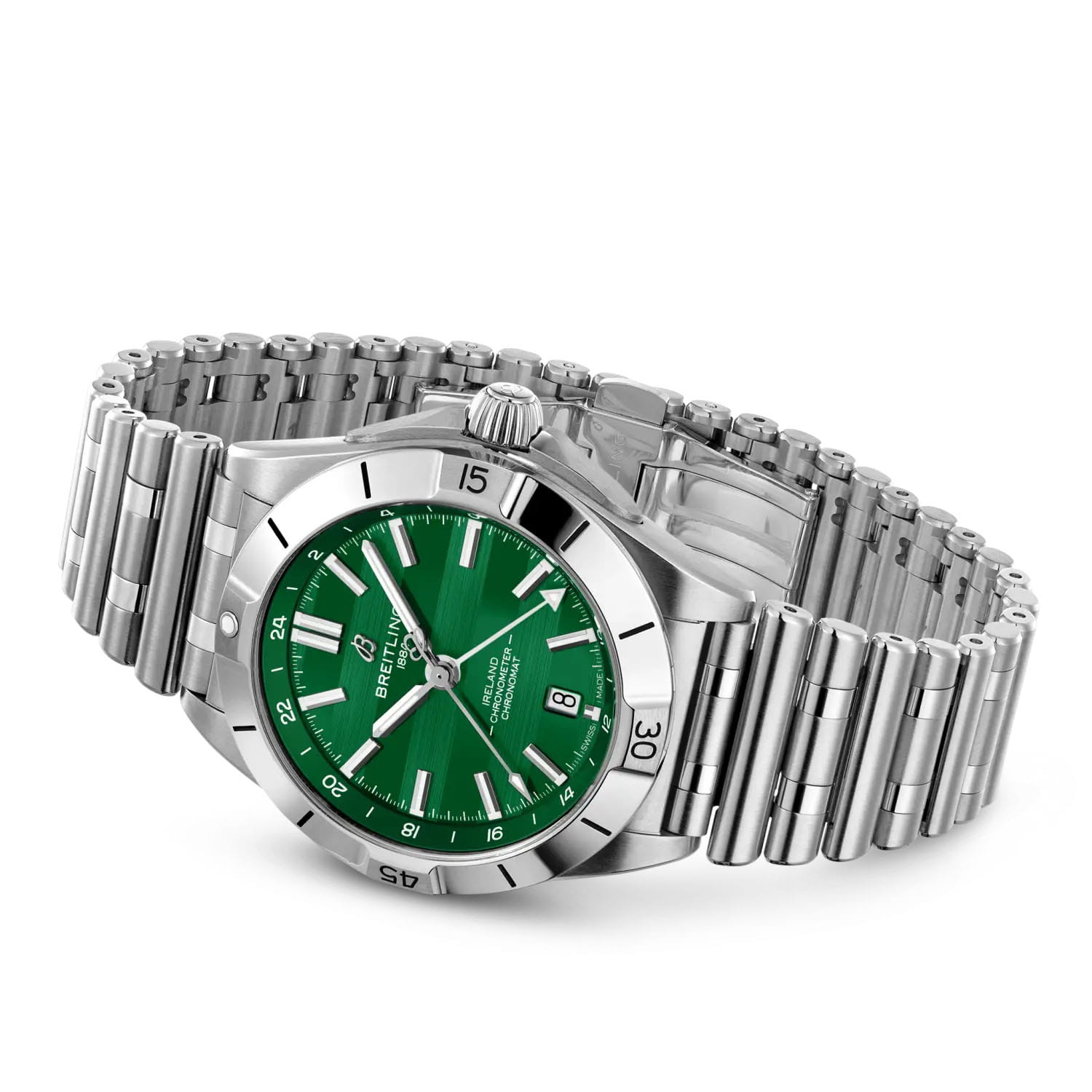 Мужские механические часы Breitling Chronomat A323987B1L1A1 — это роскошный аксессуар, сочетающий в себе классический стиль и передовые технологии. Модель выполнена из нержавеющей стали с диаметром корпуса 40 мм и толщиной 11,77 мм, что делает её прочной и устойчивой к царапинам. Циферблат зелёного цвета дополнен индикатором второго часового пояса, а его поверхность защищена выпуклым сапфировым стекломСапфировое стеклоПрочный и надёжный материал из кристалла сапфира синтетического происхождения, характеризующийся особой твёрдостью и устойчивостью к царапинам и повреждениям. с двусторонним антибликовым покрытиемАнтибликовое покрытиеСлой оксида металла в 0,13-0,3 микрон, благодаря которому стекло часов не бликует и не отражает свет. Антибликовое покрытие уменьшает отражение света в 10 раз, обеспечивая отличную читаемость показателей циферблата., устойчивым к повреждениям. Задняя крышка завинчивается, а заводная головка завинченная, с двумя прокладками, что обеспечивает надёжную фиксацию на запястье. Часы оснащены автоматическим механизмом Breitling Caliber 32, обеспечивающим запас хода до 42 часов и частоту колебаний 28 800 полуколебаний в час. Функции включают отображение времени и второй часовой пояс. Водонепроницаемость позволяет использовать модель при плавании и других водных активностях без глубокого погружения. Браслет из нержавеющей стали шириной 20 мм оснащён застёжкой «бабочка» с кнопкамиЗастёжка "бабочка"Такой вид застёжки дополняется предохранителями, помогающими избежать случайного раскрытия браслета. Обладают изящным исполнением. , обеспечивающей комфорт и надёжную фиксацию на запястье. На задней крышке выгравирован логотип команды, которой посвящена модель, и надпись «Один из 250». Это лимитированная серия, выпущенная всего 250 экземпляров, что подчёркивает её уникальность. Гарантия 2 года подтверждает качество и долговечность изделия. Эти часы станут универсальным аксессуаром для тех, кто ценит сочетание стиля, функциональности и надёжности — идеальный выбор для повседневной носки и активного образа жизни.