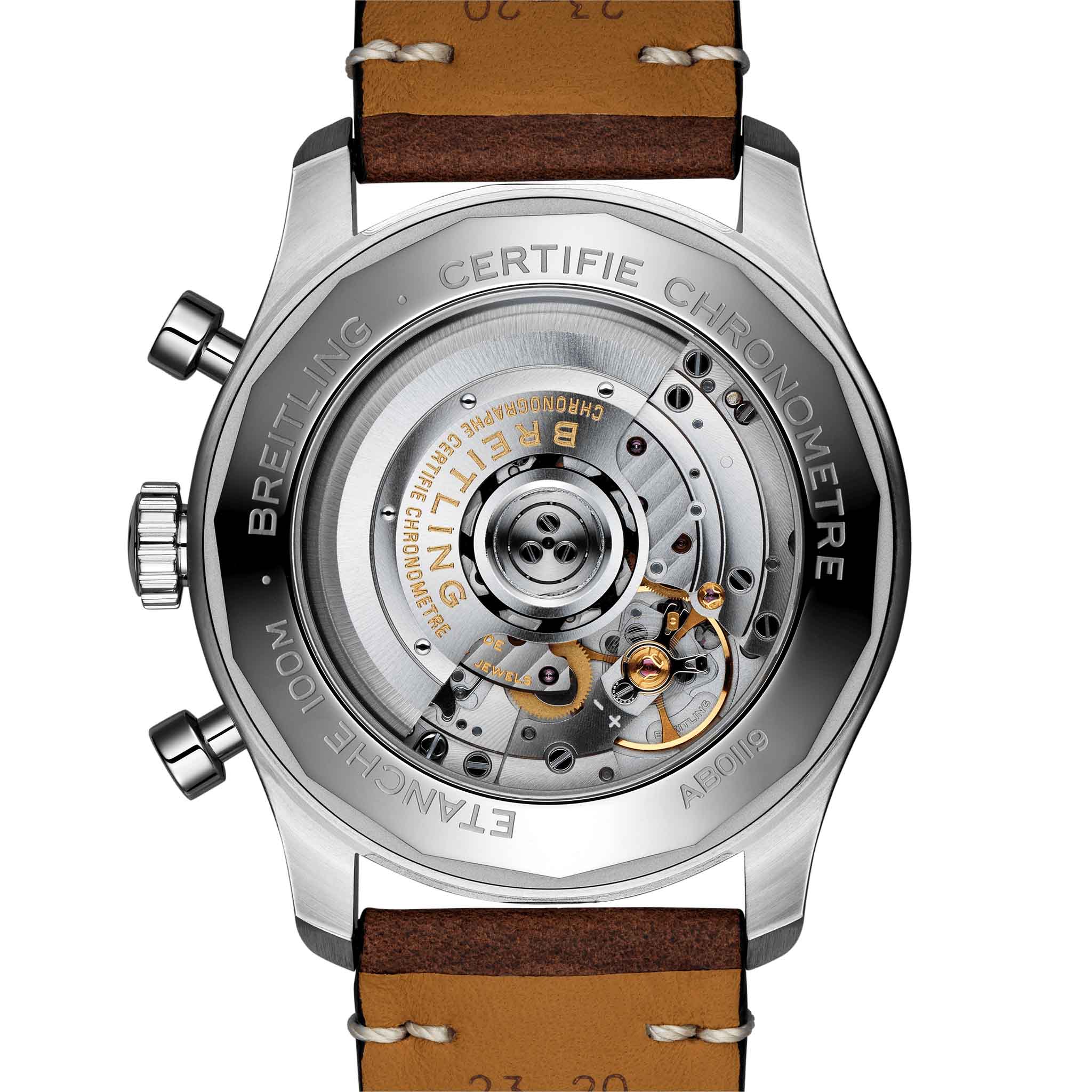 Корпус часов Aviator 8 B01 Chronograph 43 Mosquito оснащен мануфактурным калибром Breitling Manufacture Caliber 01. БезельБезельВнешний ободок, закрепляющий стекло. В спортивных часах так называется поворотное кольцо с делениями на циферблате, выполняет роль таймера – замеряет отрезки времени на шкале. Неподвижный безель – элемент декора. Однонаправленно вращающийся безель на дайверских часах позволяет фиксировать моменты погружения и выныривания на поверхность. модели изготовлен из сатинированной нержавеющей стали с высокопрочным углеродным покрытием DLCDLC-покрытиеDiamond like carbon - одно из лучших видов покрытия, представляющее собой углерод с алмазными свойствами. На поверхность материала наносятся распавшиеся молекулы углерода, превращающиеся в плёнку из алмазоподобных связей, которая перенимает твёрдость алмаза..