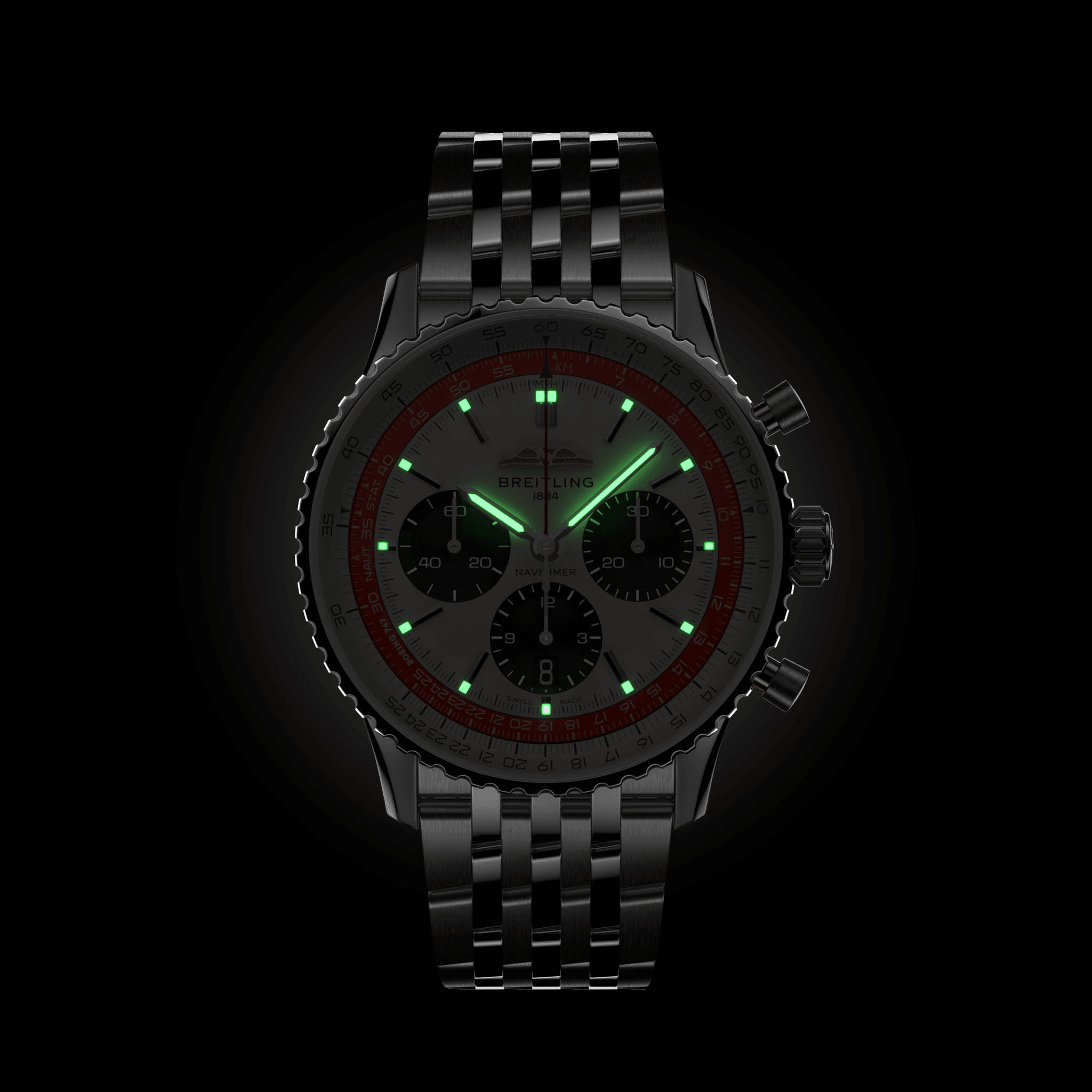 Мужские швейцарские часы-хронографХронографФункция позволяет измерять отрезки времени с особой точностью: часы, минуты, секунды. Верным признаком хронографа является наличие на циферблате 3 дополнительных окошек-счётчиков. с секундомеромСекундомерСекундоме́р — прибор, способный измерять интервалы времени с точностью до долей секунды. Breitling Navitimer B01 Chronograph 43 Boeing 747 AB01383B1G1A1, механический механизм (автоматический калибр) с высокой точностью. Сапфировое стеклоСапфировое стеклоПрочный и надёжный материал из кристалла сапфира синтетического происхождения, характеризующийся особой твёрдостью и устойчивостью к царапинам и повреждениям. устойчивое к появлению царапин, обладающее высокой прозрачностью. Класс водозащиты: 30 метров, позволит защитить корпус от случайных брызг или капель дождя. Корпус часов изготовлен из стали. Шкала тахиметраТахиметрРазмеченная шкала, располагается на ободке или безеле часов. Тахиметр позволяет рассчитать скорость на определённом участке пути, расстояние измеряется в километрах или милях. на циферблате. Часы имеют сертификат COSCСертификат COSCОфициальный сертификат, подтверждающий то, что часы ходят с особо высокой точностью. Для получения документа часы подвергаются тестовым испытаниям, разработанным швейцарским институтом тестирования хронометров COSC. Допустимая норма для механических часов -4/+6 секунд в день, для кварцевых моделей +/- 0,07 секунд в день.. Окошко даты находится в положении 6 часов. Стрелки и метки с люминесцентным покрытиемЛюминесцентное покрытиеПозволяет считывать показания времени в темноте. Производители наносят на стрелки, часовые индексы, безель или поверхность циферблата светонакопительный состав, дающий холодное свечение.. Стальной браслет с застёжкой-бабочкой с кнопкамиЗастёжка "бабочка"Такой вид застёжки дополняется предохранителями, помогающими избежать случайного раскрытия браслета. Обладают изящным исполнением. .