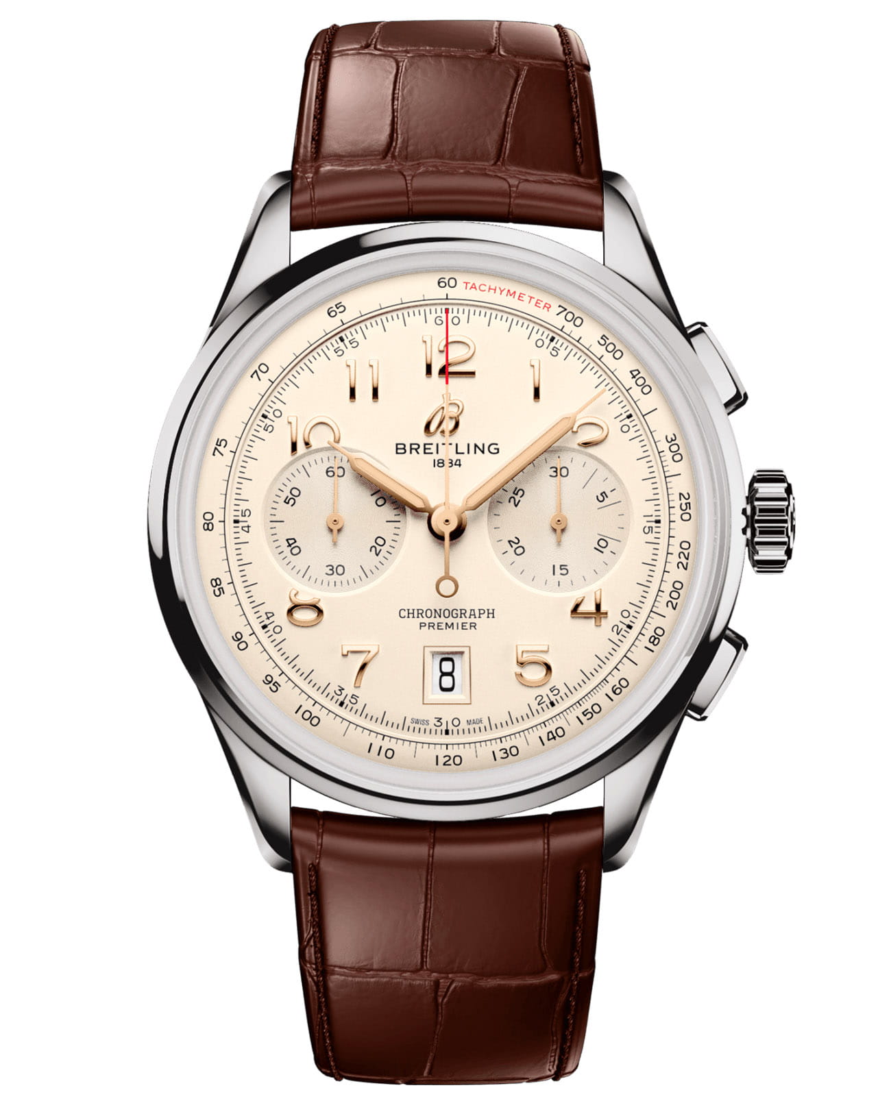 Мужские швейцарские часы-хронографХронографФункция позволяет измерять отрезки времени с особой точностью: часы, минуты, секунды. Верным признаком хронографа является наличие на циферблате 3 дополнительных окошек-счётчиков. с тахиметромТахиметрРазмеченная шкала, располагается на ободке или безеле часов. Тахиметр позволяет рассчитать скорость на определённом участке пути, расстояние измеряется в километрах или милях. Breitling Premier B01 Chronograph 42 AB0145211G1P2, механический механизм (автоматический калибр) с высокой точностью. Сапфировое стеклоСапфировое стеклоПрочный и надёжный материал из кристалла сапфира синтетического происхождения, характеризующийся особой твёрдостью и устойчивостью к царапинам и повреждениям. с антибликовым покрытием устойчивое к появлению царапин, обладающее высокой прозрачностью. Класс водозащиты: 100 метров, позволит плавать, нырять и заниматься другими водными видами спорта. Корпус часов изготовлен из стали. Кожаный крокодиловый ремешок с раскладной застёжкойРаскладная застёжкаТакой тип застёжки используется только на браслетах из металла. Она никогда не раскрывается полностью, происходит разделение на 2 и более частей. Раскладывающая застёжка снизит вероятность потери часов к минимуму.. Стрелки с люминесцентным покрытиемЛюминесцентное покрытиеПозволяет считывать показания времени в темноте. Производители наносят на стрелки, часовые индексы, безель или поверхность циферблата светонакопительный состав, дающий холодное свечение.. Окошко даты находится в положении 6 часов. СекундомерСекундомерСекундоме́р — прибор, способный измерять интервалы времени с точностью до долей секунды..