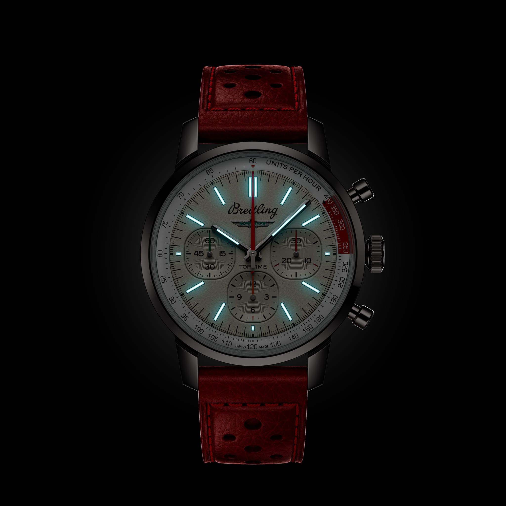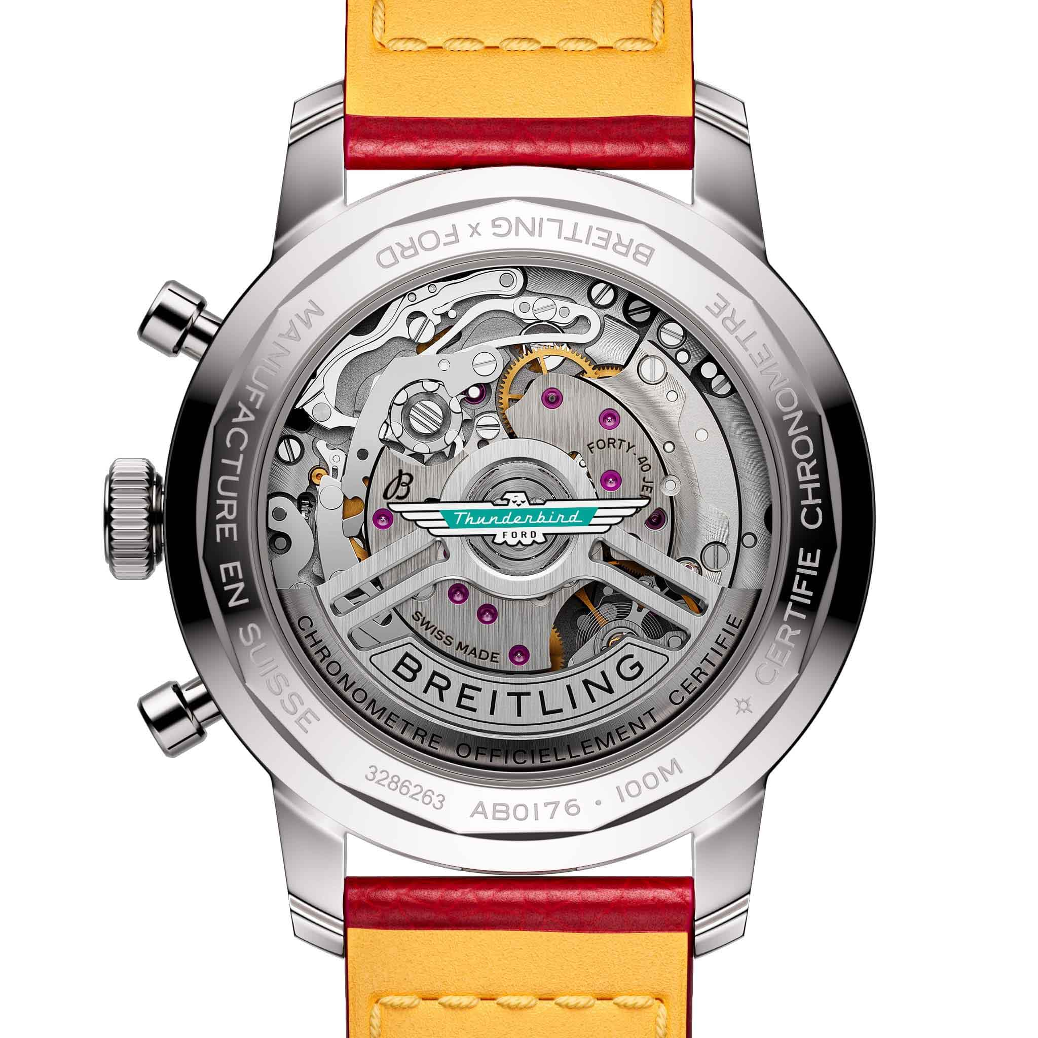 Мужские швейцарские часы-хронографХронографФункция позволяет измерять отрезки времени с особой точностью: часы, минуты, секунды. Верным признаком хронографа является наличие на циферблате 3 дополнительных окошек-счётчиков. с тахиметромТахиметрРазмеченная шкала, располагается на ободке или безеле часов. Тахиметр позволяет рассчитать скорость на определённом участке пути, расстояние измеряется в километрах или милях. Breitling Top Time B01 Ford Thunderbird AB01766A1A1X1, механический механизм (автоматический калибр) с высокой точностью. Сапфировое стеклоСапфировое стеклоПрочный и надёжный материал из кристалла сапфира синтетического происхождения, характеризующийся особой твёрдостью и устойчивостью к царапинам и повреждениям. устойчивое к появлению царапин, обладающее высокой прозрачностью. Класс водозащиты: 100 метров, позволит плавать, нырять и заниматься другими водными видами спорта. Корпус часов изготовлен из стали. Кожаный ремешок с раскладной застёжкойРаскладная застёжкаТакой тип застёжки используется только на браслетах из металла. Она никогда не раскрывается полностью, происходит разделение на 2 и более частей. Раскладывающая застёжка снизит вероятность потери часов к минимуму.. Стрелки и метки с люминесцентным покрытиемЛюминесцентное покрытиеПозволяет считывать показания времени в темноте. Производители наносят на стрелки, часовые индексы, безель или поверхность циферблата светонакопительный состав, дающий холодное свечение..