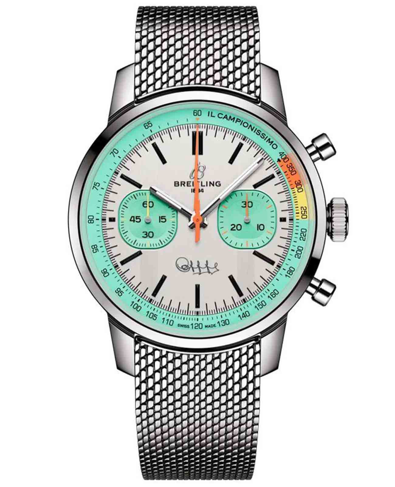 Breitling Top Time B01 Fausto Coppi AB01768A1A1A1 — лимитированные часы, вдохновлённые легендой велоспорта Фаусто Коппи и эстетикой ретро-хронографов 60-х годов. Корпус диаметром 41 мм выполнен из нержавеющей стали с комбинированной сатинированной и полированной отделкой. Прозрачная задняя крышка с гравировкой «Fausto Coppi Tribute» и «One of 750» подчёркивает уникальность выпуска. Циферблат защищён сапфировым стекломСапфировое стеклоПрочный и надёжный материал из кристалла сапфира синтетического происхождения, характеризующийся особой твёрдостью и устойчивостью к царапинам и повреждениям. с антибликовым покрытиемАнтибликовое покрытиеСлой оксида металла в 0,13-0,3 микрон, благодаря которому стекло часов не бликует и не отражает свет. Антибликовое покрытие уменьшает отражение света в 10 раз, обеспечивая отличную читаемость показателей циферблата.. Белый матовый циферблат украшен бирюзовыми субциферблатами и надписью «Il Campionissimo» по внешнему кругу. Подпись Fausto Coppi расположена на отметке 6 часов. Внутри установлен швейцарский автоматический калибр COSC-сертифицированныйСертификат COSCОфициальный сертификат, подтверждающий то, что часы ходят с особо высокой точностью. Для получения документа часы подвергаются тестовым испытаниям, разработанным швейцарским институтом тестирования хронометров COSC. Допустимая норма для механических часов -4/+6 секунд в день, для кварцевых моделей +/- 0,07 секунд в день. хронографХронографФункция позволяет измерять отрезки времени с особой точностью: часы, минуты, секунды. Верным признаком хронографа является наличие на циферблате 3 дополнительных окошек-счётчиков. Breitling B01, обеспечивающий точность, стабильность и запас хода до 70 часов. Модель укомплектована браслетом миланского плетения на застёжке «бабочка» с кнопкамиЗастёжка "бабочка"Такой вид застёжки дополняется предохранителями, помогающими избежать случайного раскрытия браслета. Обладают изящным исполнением. . Водонепроницаемость 100 метров делает часы надёжными не только в городе, но и в активной среде. Эта лимитированная модель — признание в любви к велоспорту и винтажной эстетике.