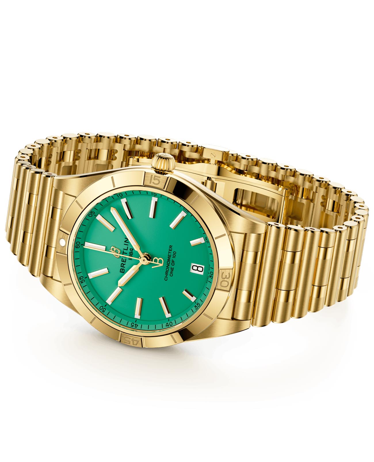 Женские швейцарские часы Breitling Chronomat Automatic 36 Victoria Beckham K103801A1L1K1 с надёжным автоматическим механизмом, выпущенные лимитированной серией всего из 1500 экземпляров в сотрудничестве с модным домом Victoria Beckham. Сапфировое стеклоСапфировое стеклоПрочный и надёжный материал из кристалла сапфира синтетического происхождения, характеризующийся особой твёрдостью и устойчивостью к царапинам и повреждениям. устойчивое к мелким механическим повреждениям. Корпус и браслет часов изготовлены из желтого 18-каратного золота18-каратное золотоОбозначение по каратной системе пробирования, оно показывает, сколько драгоценного металла содержится в изделии. 18 карат - в составе 75% чистого золота, соответствует 750 пробе.