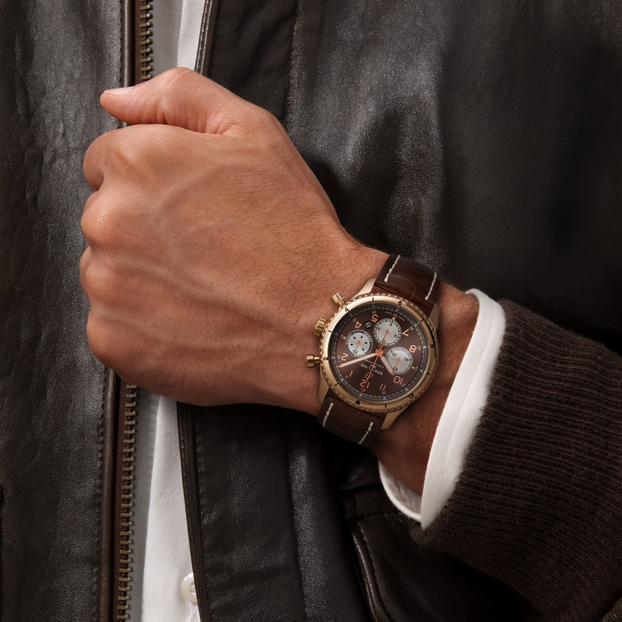 На циферблате имеются 30-минутный и 12-часовой счетчик, а также окошко отображения даты. Флагман данной линейки – Aviator 8 B01 Chronograph 43 – доступен в исполнении из нержавеющей стали с черным или синим циферблатом, либо в корпусе из 18-каратного розового золота с бронзовым циферблатом.