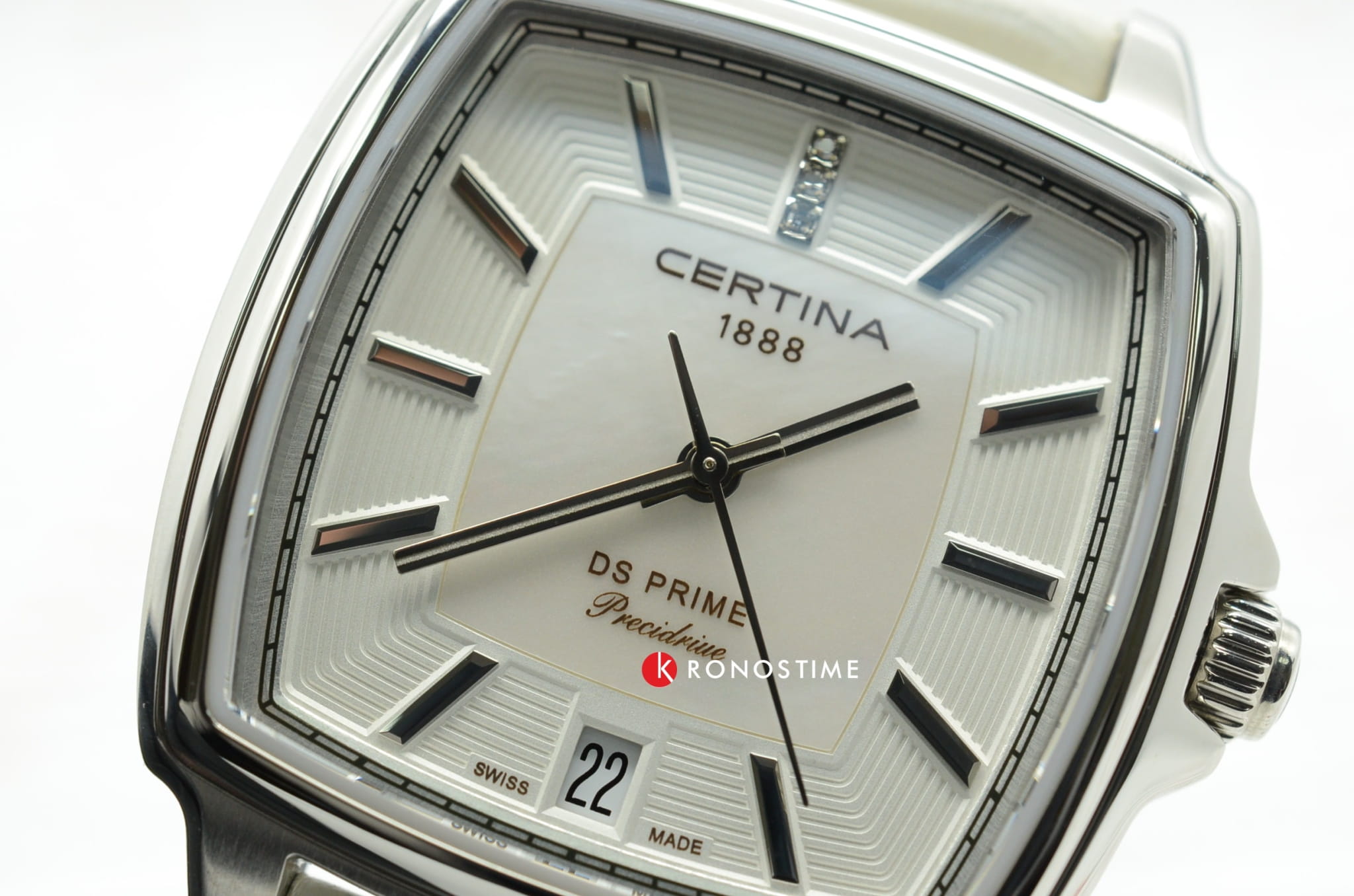 Модель с квадратным корпусом предстаёт в элегантном стиле. Циферблат с перламутровой вставкой украшен 3 бриллиантами. Работу часов обеспечивает швейцарский кварцевый механизм Precidrive™Precidrive™Инновационный кварцевый механизм Certina. Часы, оснащённые этим швейцарским калибром, приравниваются к точности к сертифицированным хронометрам, точность хода составляет +/-10 секунд в год.. Сапфировое стекло имеет антибликовую обработку. Белый ремешок из натуральной кожи.