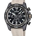 Корпус часов изготовлен из карбона, что придаёт им прочность и долговечность. Класс водозащиты 100 метров позволяет носить часы в условиях активного водного спорта, включая плавание, ныряние и другие водные виды спорта. Каучуковый ремешок на стандартной застёжке обеспечивает комфортное и надёжное крепление на запяте. Стрелки и метки с люминесцентным покрытиемЛюминесцентное покрытиеПозволяет считывать показания времени в темноте. Производители наносят на стрелки, часовые индексы, безель или поверхность циферблата светонакопительный состав, дающий холодное свечение.. Окошко даты находится в положении 6 часов.