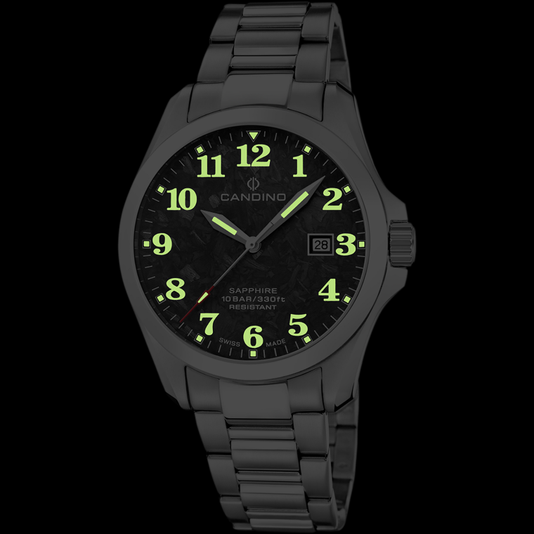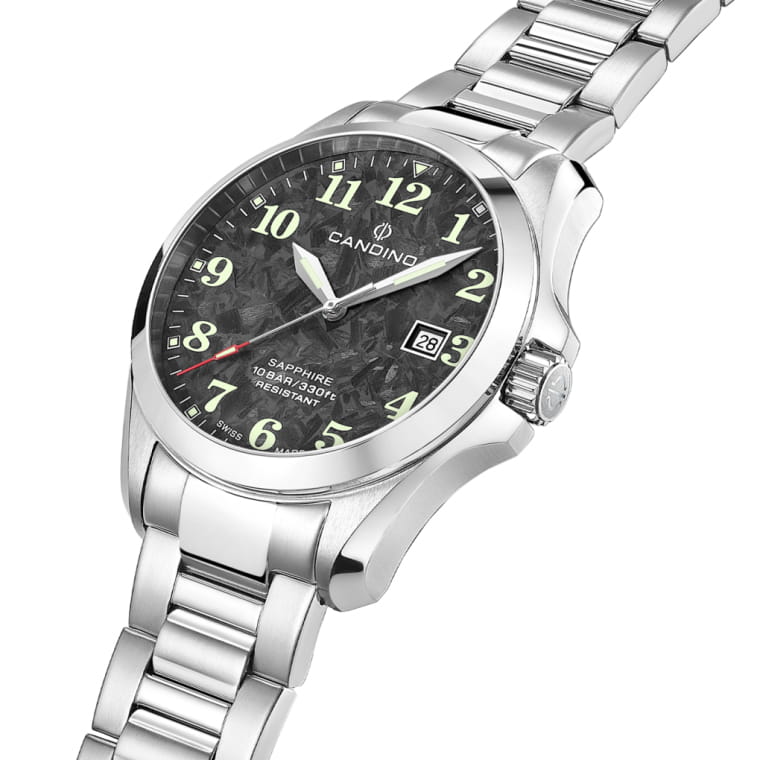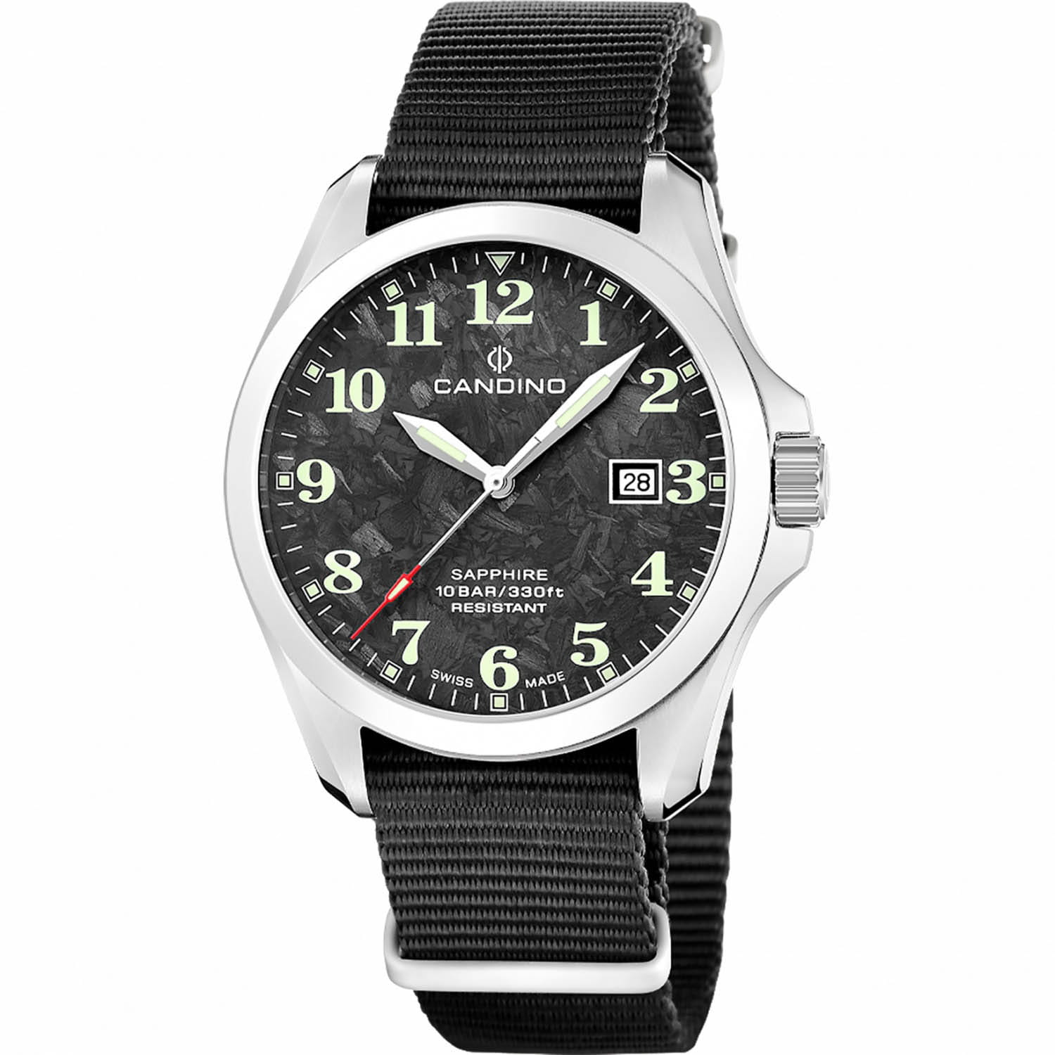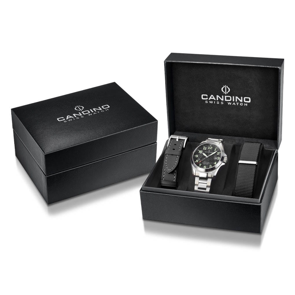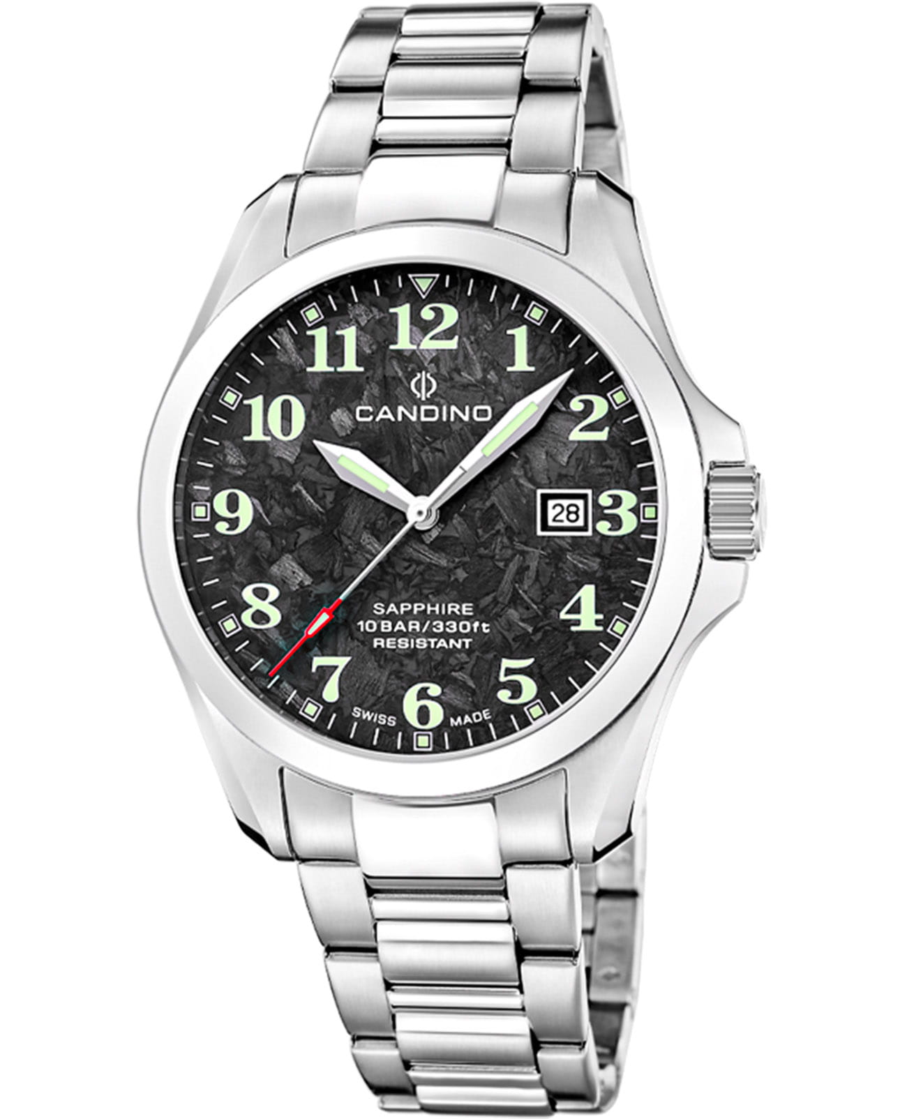 Мужские кварцевые часы Candino C4785/4 — это стильный и надёжный аксессуар швейцарского производства, сочетающий элегантность и функциональность. Корпус круглой формы выполнен из нержавеющей стали и защищён сапфировым стекломСапфировое стеклоПрочный и надёжный материал из кристалла сапфира синтетического происхождения, характеризующийся особой твёрдостью и устойчивостью к царапинам и повреждениям., устойчивым к царапинам. Циферблат чёрного цвета оформлен штрихами в качестве индикации, а стрелки и метки оснащены люминесцентным покрытиемЛюминесцентное покрытиеПозволяет считывать показания времени в темноте. Производители наносят на стрелки, часовые индексы, безель или поверхность циферблата светонакопительный состав, дающий холодное свечение., обеспечивающим хорошую читаемость в темноте. Окошко даты расположено на отметке 3 часа, что делает часы практичными в повседневном использовании. Браслет из нержавеющей стали фиксируется на раскладной застёжкеРаскладная застёжкаТакой тип застёжки используется только на браслетах из металла. Она никогда не раскрывается полностью, происходит разделение на 2 и более частей. Раскладывающая застёжка снизит вероятность потери часов к минимуму., обеспечивая удобство и надёжность ношения. Водонепроницаемость 50 м позволяет использовать часы в повседневных условиях, защищая от случайных брызг и капель дождя. Модель подчёркивает индивидуальность и хороший вкус владельца, оставаясь универсальным выбором для любого образа. В комплекте предусмотрены два ремешка из кожи и текстиля.