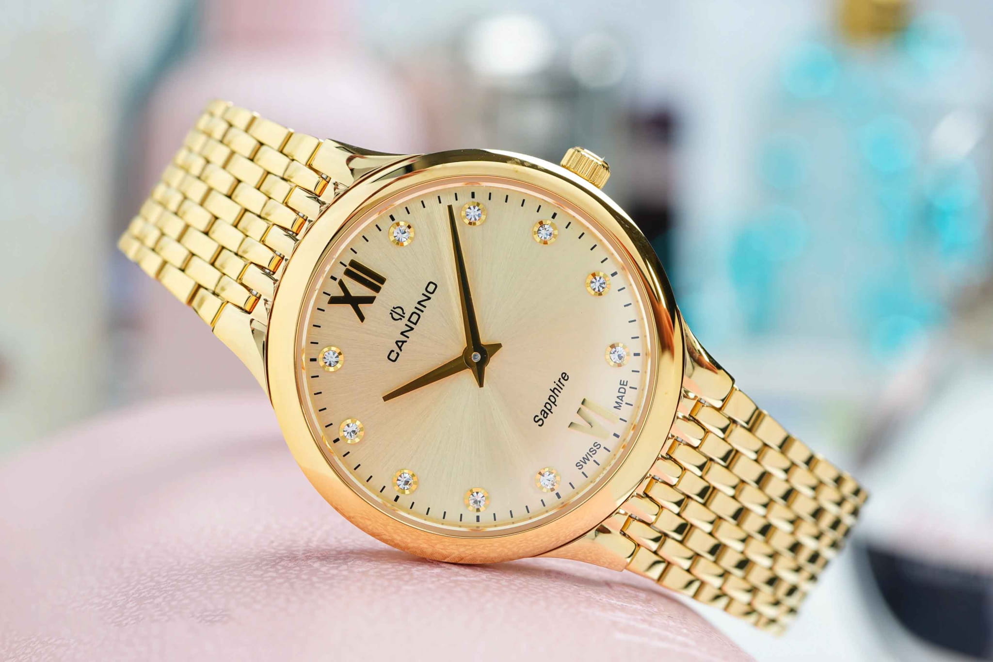 Женские кварцевые часы Candino из коллекции Series 1947 — это утончённый аксессуар, сочетающий минимализм и швейцарское качество. Корпус диаметром 33,5 мм и толщиной 6 мм выполнен из нержавеющей стали 316L с PVD-покрытиемPVDУльтратонкое покрытие наносится в технике вакуумного напыления, сочетает в себе нитрид титана особой прочности со слоем золота или оксида хрома. Несёт в себе декоративную или защитную функцию. жёлтого золота. Циферблат золотого цвета оформлен двумя стрелками без индикации даты, что придаёт дизайну чистоту и элегантность. Циферблат защищён сапфировым стекломСапфировое стеклоПрочный и надёжный материал из кристалла сапфира синтетического происхождения, характеризующийся особой твёрдостью и устойчивостью к царапинам и повреждениям., устойчивым к царапинам. Метки циферблата выполнены из циркония. Механизм — кварцевый произведённый в Швейцарии. Часы оснащены стальным браслетом с PVD-покрытиемPVDУльтратонкое покрытие наносится в технике вакуумного напыления, сочетает в себе нитрид титана особой прочности со слоем золота или оксида хрома. Несёт в себе декоративную или защитную функцию. жёлтого золота на застёжке «бабочка» с кнопкамиЗастёжка "бабочка"Такой вид застёжки дополняется предохранителями, помогающими избежать случайного раскрытия браслета. Обладают изящным исполнением. . Водонепроницаемость 50 м позволяет использовать часы в повседневных условиях. Гарантия — 2 года. Идеальный выбор для тех, кто ценит лаконичный стиль, точность и надёжность.