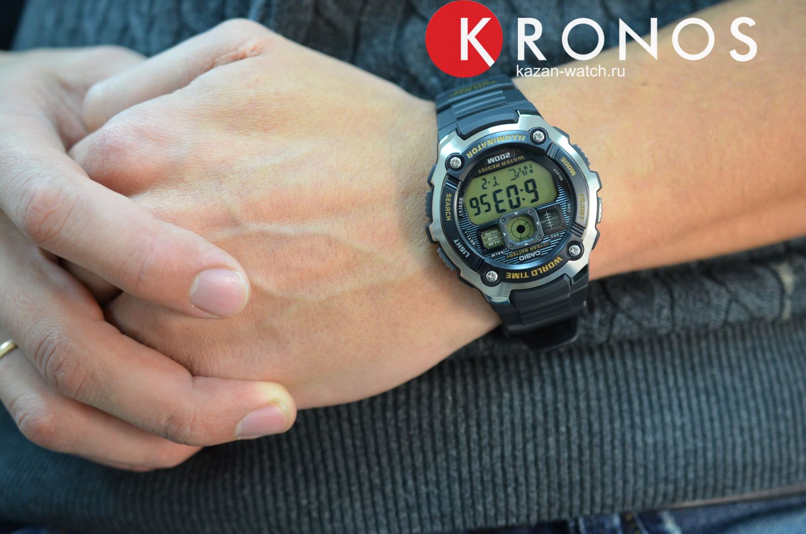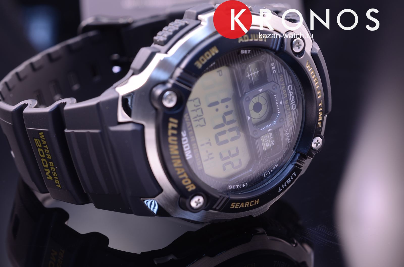 Циферблат подсвечивается светодиодом. Мировое время – 48 городов (31 часовой пояс), всемирное координированное время (UTC). Функция включения/отключения летнего времени. 12-ти и 24-х часовой формат времени. Секундомер с точностью показаний 1/100 сек и временем измерения 24 часа. Сплит-хронограф. Таймер обратного отсчета от 1мин до 24ч. Функция включения/отключения звука.