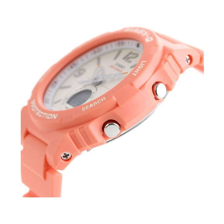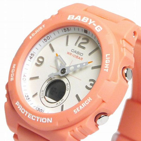 Модель из коллекции Baby-G представлена в оранжевом исполнении, солнечный оттенок акцентирует внимание на жизнерадостной натуре своего владельца. Женские японские наручные часы с противоударным корпусом Casio Baby-G BGA-260-4A, кварцевый механизм с высокой точностью. Класс водозащиты: 100 метров, позволит плавать, нырять и заниматься другими водными видами спорта. Корпус часов изготовлен из пластика. Ударопрочный корпусУдаропрочный корпусМеханизм заключён в корпус, выполненный из современных материалов, устойчивых к ударам, механическим повреждениям и падению с высоты: инновационный пластик, карбон, нержавеющая сталь, титан. защищает механизм от ударов и вибрации. Минималистичный циферблат дополнен стрелками необычной формы с яркими наконечниками, они имеют люминесцентное покрытиеЛюминесцентное покрытиеПозволяет считывать показания времени в темноте. Производители наносят на стрелки, часовые индексы, безель или поверхность циферблата светонакопительный состав, дающий холодное свечение. для лучшей считываемости показателей времени в темноте. Гибкий полимерный ремешок красиво смотрится в сочетании со спортивным или повседневным стилем. Светодиодная подсветкаСветодиодная подсветкаСветодиодная или LED-подсветка обеспечивает появление яркого холодного свечения за счёт LED-элементов - маленьких лампочек. Они потребляют минимальное количество энергии, чаще всего можно встретить 1 светодиод, в нижней части циферблата. дисплея. Цвет подсветки: белый. Подсветка NeobriteПодсветка NeobriteИспользование светонакопительных составов на основе сульфида цинка или алюмината стронция, яркий свет можно наблюдать на протяжении 6-10 часов после «зарядки» часов около источника света. обеспечивает длительное послесвечение в темноте даже после кратковременного нахождения на свету. Мировое времяМировое время Полезное часовое усложнение, отображающее время в основных городах и известных областях по всему миру, оно связано с часовыми поясами, удобно для путешественников и бизнесменов. – 27 городов (29 часовых поясов), всемирное координированное время (UTCUTCВсемирное кординационное время, не имеющее привязки к географическому положению Гринвича, основывается на атомном отсчёте времени. Регулировка времени осуществляется более точно, чем устаревшее GMT.