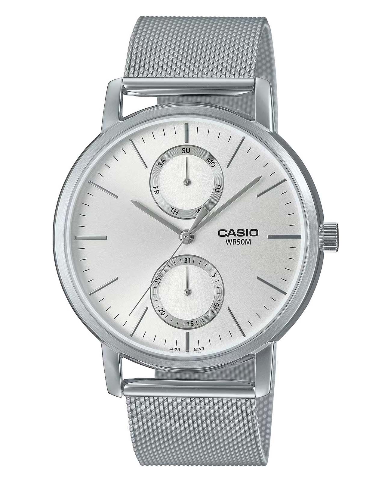 Японские мужские часы с минеральным стекломМинеральное стеклоМинеральное стекло представляет собой искусственно выращенный минерал кварца. Такое стекло отличается особой устойчивостью к повреждениям и царапинам. Уступает по некоторым качествам сапфировому стеклу. Casio Collection MTP-B310M-7A, кварцевый механизм с высокой точностью. Корпус часов изготовлен из стали.  Циферблат с метками в виде штрихов выполнен по технологии Sunray (солнечные лучи). Число и день недели вынесены на отдельные циферблаты. Батарейка рассчитана на 3 года.  Рифленая заводная головка. Класс водозащиты: 50 метров, позволит защитить корпус от случайных брызг или капель дождя. Стальной браслет миланского плетения на раскладном замкеРаскладной замокДанный вариант застежки используется только на часах с металлическим браслетом. Отличительная особенность такого крепления в том, что длина браслета становится универсальной и вы можете самостоятельно отрегулировать нужный вам размер – застежка просто двигается по браслету часов..