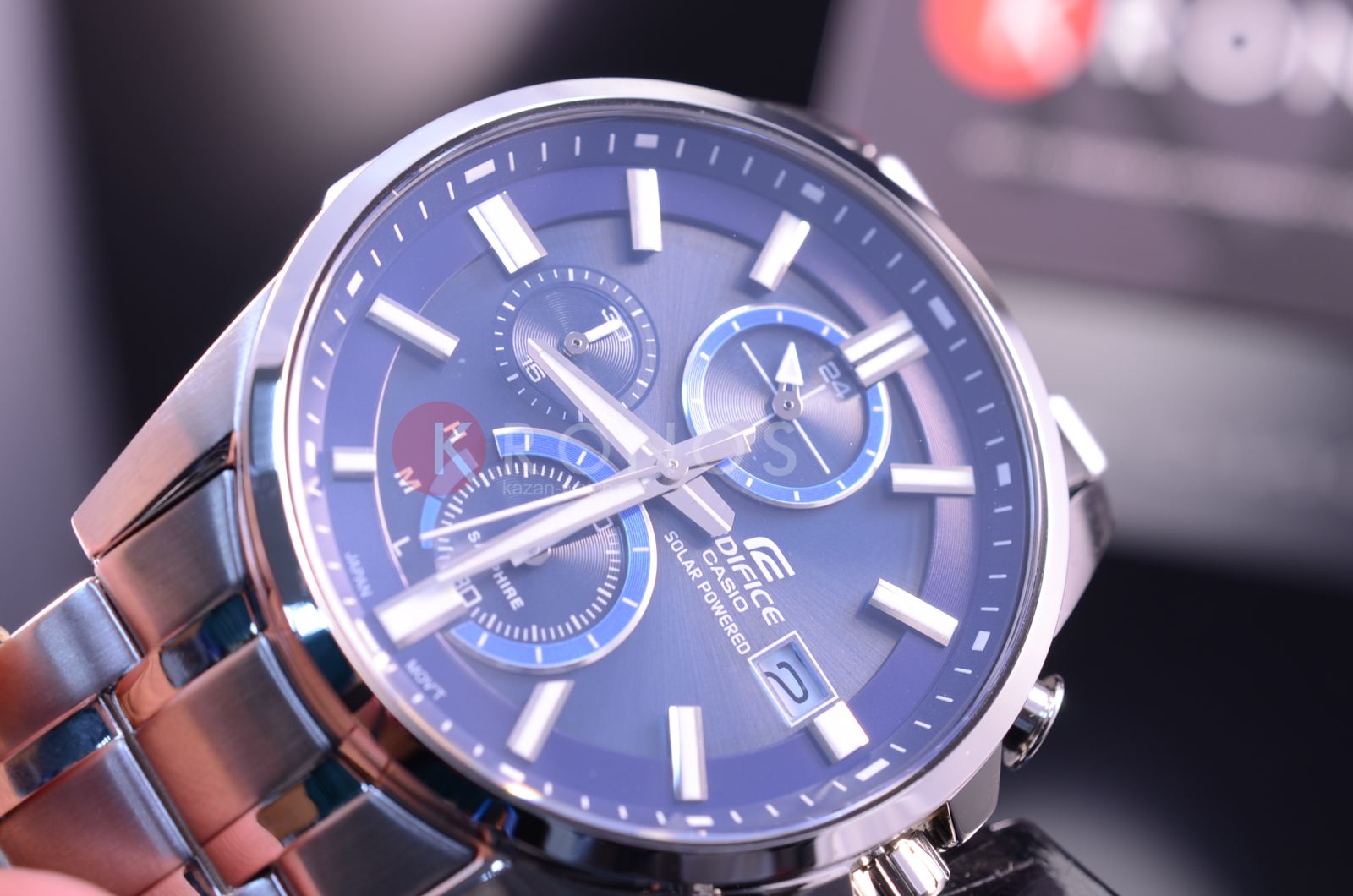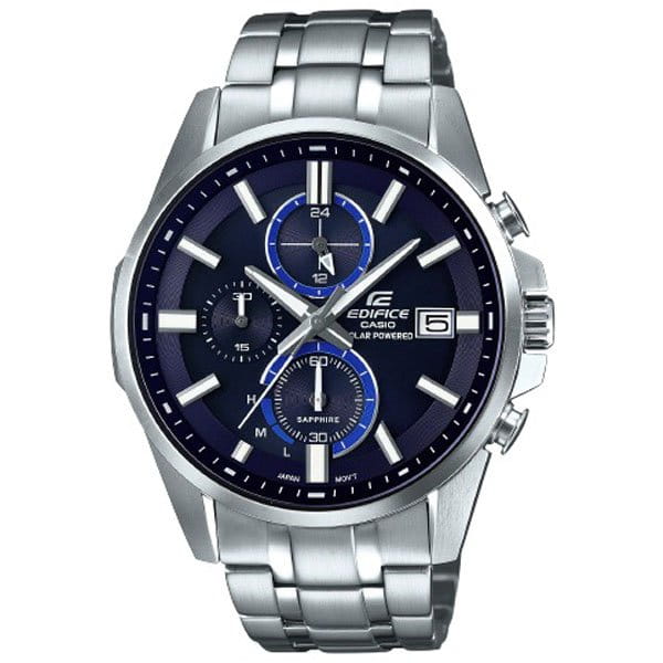 Стильные наручные кварцевые мужские часы на солнечной батарейке. Индикатор уровня заряда аккумулятора (Этот индикатор отображает текущий уровень заряда аккумулятора). Круглый корпус и браслет часов выполнены из высокопрочной стали. Синий фон циферблата с контрастными элементами дизайна. Водонепроницаемость часов составляет 10 ATM. Сапфировое стекло, устойчивое к появлению царапин. Часы оснащены хронографом. Модный и современный аксессуар.
