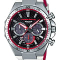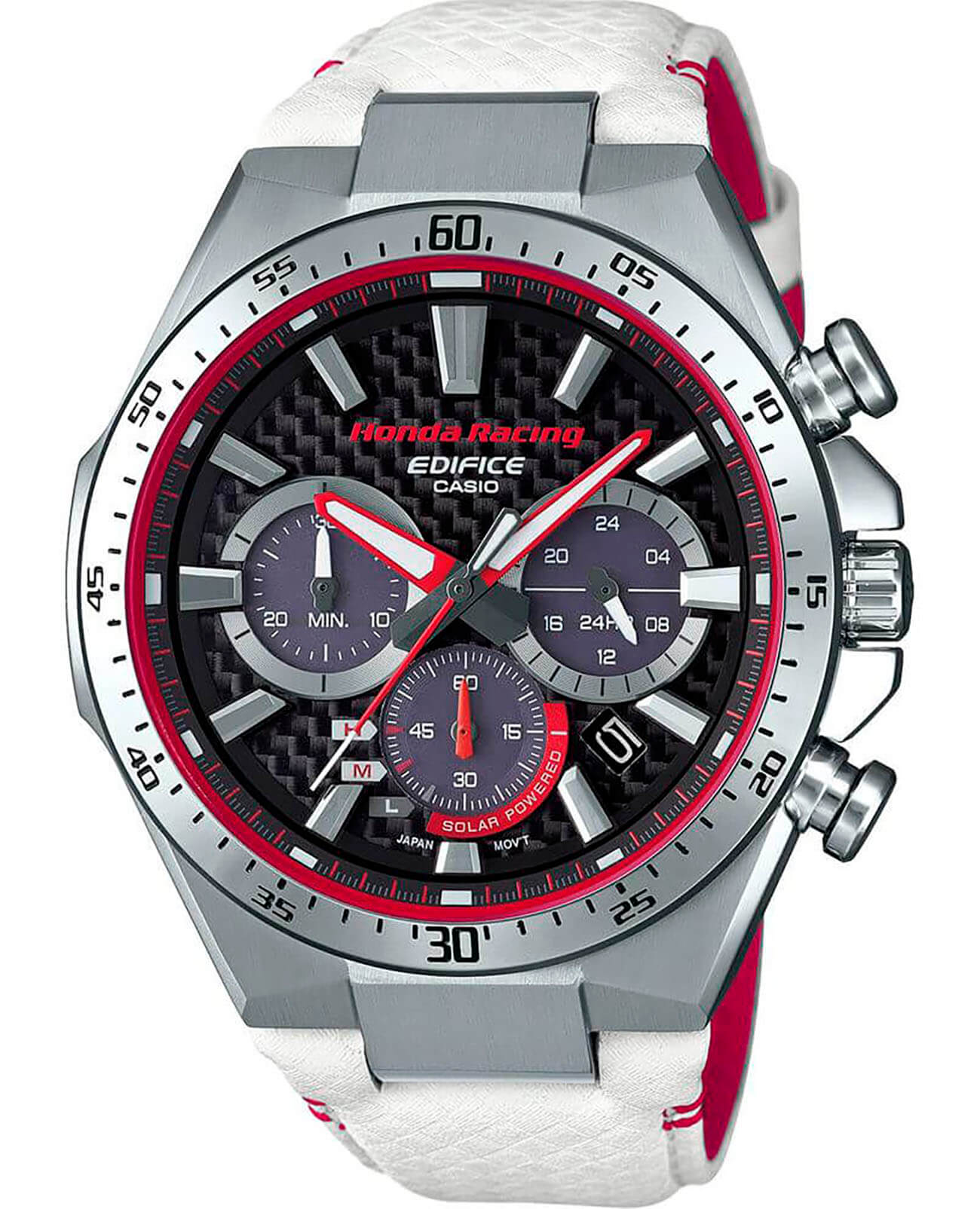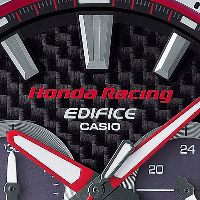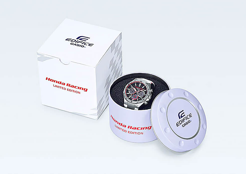 Японская корпорация Casio, в сотрудничестве с коллективом Honda Racing выпустила ограниченную серию электронных часов EDIFICE В основе разработки фигурирует популярная модель EQS-800 с комбинированным браслетом: внутренняя сторона - красного оттенка, а наружная - белого Такое сочетание соответствует цветовому ряду автогоночной команды Honda Racing, главным спонсором которой выступает Honda Motor Company, Ltd