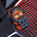 Дизайн модели умело комбинирует спортивные и fashion-элементы, чёрный матовый противоударный корпусУдаропрочный корпусМеханизм заключён в корпус, выполненный из современных материалов, устойчивых к ударам, механическим повреждениям и падению с высоты: инновационный пластик, карбон, нержавеющая сталь, титан. красиво обрамляет циферблат ярко-оранжевого цвета. По сравнению с часами серии GA-700, аксессуар получил уменьшенный размер корпуса, что положительно сказалось на комфортном ношении. Кварцевый калибр японского производства работает от батарейки, срок её службы составляет 3 года. Белая светодиодная подсветкаСветодиодная подсветкаСветодиодная или LED-подсветка обеспечивает появление яркого холодного свечения за счёт LED-элементов - маленьких лампочек. Они потребляют минимальное количество энергии, чаще всего можно встретить 1 светодиод, в нижней части циферблата. циферблата, стрелки с люминесцентным покрытиемЛюминесцентное покрытиеПозволяет считывать показания времени в темноте. Производители наносят на стрелки, часовые индексы, безель или поверхность циферблата светонакопительный состав, дающий холодное свечение.. Прочный полимерный ремешок. Водонепроницаемость 20 бар. Минеральное стекло. 12/24-часовое отображение времени. Секундомер с точностью в 1/100 секунды, мировое времяМировое время Полезное часовое усложнение, отображающее время в основных городах и известных областях по всему миру, оно связано с часовыми поясами, удобно для путешественников и бизнесменов. , таймер, будильник, календарь. Габариты: 54,1 x 48,6 x 15,5 мм.