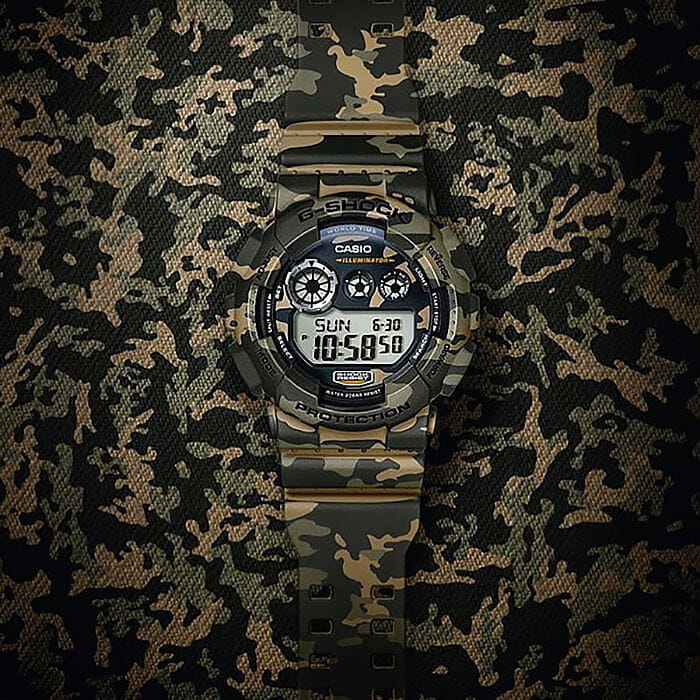 Наручные часы обладают внушительными размерами, благодаря массивному ударопрочному корпусуУдаропрочный корпусМеханизм заключён в корпус, выполненный из современных материалов, устойчивых к ударам, механическим повреждениям и падению с высоты: инновационный пластик, карбон, нержавеющая сталь, титан. и необычному дизайну они приметно смотрятся на запястье. Их поверхность имеет камуфляжный принт в песочно-болотной расцветке, циферблат же оставлен в минималистичном исполнении. Японский кварцевый механизм работает за счёт батарейки, срок службы которой составляет 7 лет. Корпус и браслет из высокопрочного пластика. Автоматическая светодиодная подсветкаСветодиодная подсветкаСветодиодная или LED-подсветка обеспечивает появление яркого холодного свечения за счёт LED-элементов - маленьких лампочек. Они потребляют минимальное количество энергии, чаще всего можно встретить 1 светодиод, в нижней части циферблата.. Закаленное минеральное стекло. Водозащита 200 метров. Включение и выключение функции кнопок. Функции: таймер обратного отсчёта, 5 будильников, хронографХронографФункция позволяет измерять отрезки времени с особой точностью: часы, минуты, секунды. Верным признаком хронографа является наличие на циферблате 3 дополнительных окошек-счётчиков., секундомер, мировое времяМировое время Полезное часовое усложнение, отображающее время в основных городах и известных областях по всему миру, оно связано с часовыми поясами, удобно для путешественников и бизнесменов. . Габариты: 55 x 51,2 x 17,4 мм.