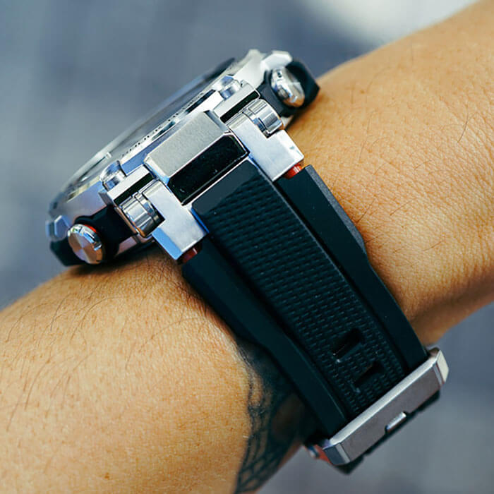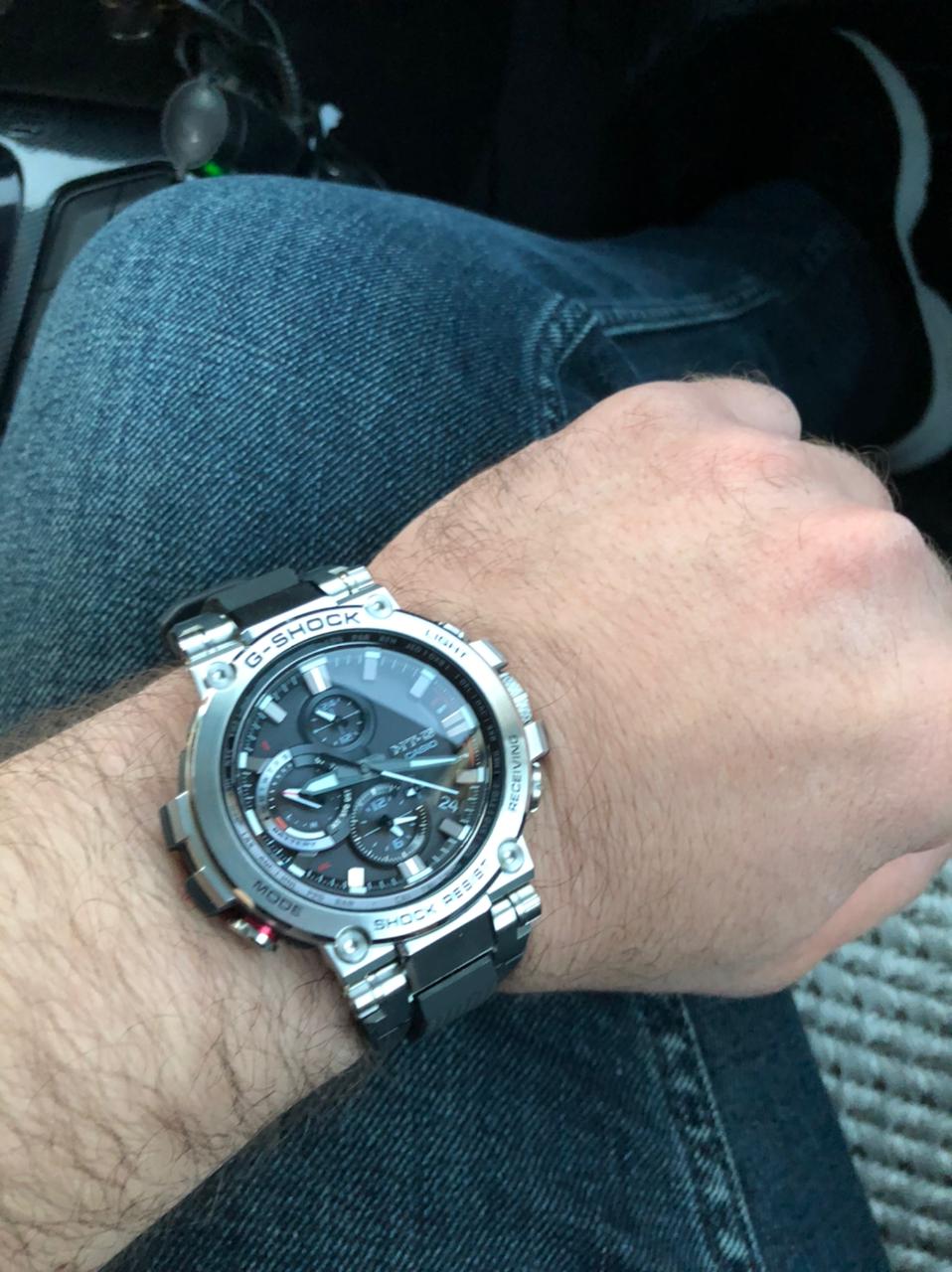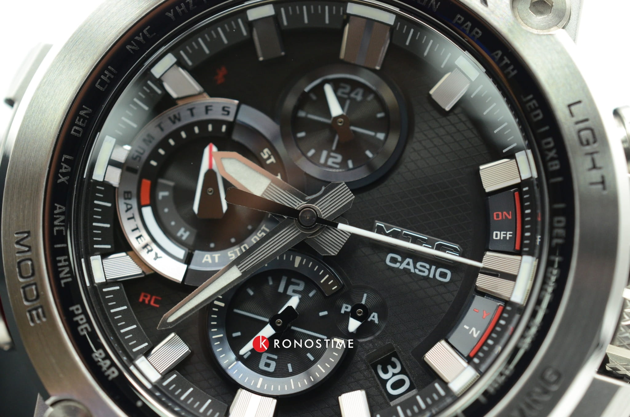 Компактный тёмный циферблат с узором в виде ромбиков стал идеальным решением для массивного стального безеляБезельВнешний ободок, закрепляющий стекло. В спортивных часах так называется поворотное кольцо с делениями на циферблате, выполняет роль таймера – замеряет отрезки времени на шкале. Неподвижный безель – элемент декора. Однонаправленно вращающийся безель на дайверских часах позволяет фиксировать моменты погружения и выныривания на поверхность.. Наручные часы MTG-B1000 выдерживают любые нагрузки благодаря особой конструкции. Ударопрочный корпусУдаропрочный корпусМеханизм заключён в корпус, выполненный из современных материалов, устойчивых к ударам, механическим повреждениям и падению с высоты: инновационный пластик, карбон, нержавеющая сталь, титан. сделан из нержавеющей стали и полимерного материала, дополнительное усиление происходит за счёт карбоновых волокон и геля Alpha Gel®, призванного защищать от негативного воздействия вибрации и температурных перепадов. Модель обладает технологией , заряжаясь от солнечного света. Индикатор состояния аккумулятора. Сферическое сапфировое стекло с антибликовой обработкой. Коррекция текущего времени радиосигналом. Bluetooth-синхронизация со смартфономBluetoothСовременная технология, позволяющая синхронизировать часы с телефоном и переносить данные. Часы с Bluetooth расширяют возможности вашего смартфона и делают его использование ещё более удобным.. Водонепроницаемость 20 бар. ЛюминесцентнаяЛюминесцентное покрытиеПозволяет считывать показания времени в темноте. Производители наносят на стрелки, часовые индексы, безель или поверхность циферблата светонакопительный состав, дающий холодное свечение. и светодиодная подсветкаСветодиодная подсветкаСветодиодная или LED-подсветка обеспечивает появление яркого холодного свечения за счёт LED-элементов - маленьких лампочек. Они потребляют минимальное количество энергии, чаще всего можно встретить 1 светодиод, в нижней части циферблата.. Возможности: таймер, будильник, мировое времяМировое время Полезное часовое усложнение, отображающее время в основных городах и известных областях по всему миру, оно связано с часовыми поясами, удобно для путешественников и бизнесменов. , секундомер, календарь, UTCUTCВсемирное кординационное время, не имеющее привязки к географическому положению Гринвича, основывается на атомном отсчёте времени. Регулировка времени осуществляется более точно, чем устаревшее GMT.