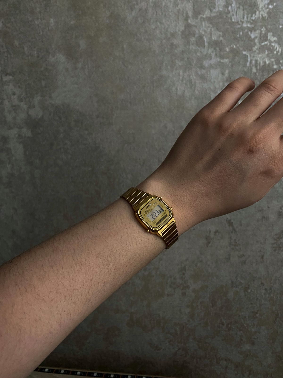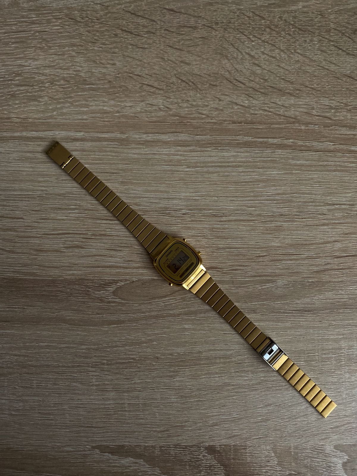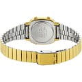 Женские электронные часы. Оснащены функциями: секундомера, таймера, календаря и подсветки. Корпус - Пластиковый; Стекло - Пластик; Водозащита - 30 м. (WR 30); Материал ремешка - Нержавеющая сталь, PVD покрытие; Цвет ремешка - Золотистый; Цвет циферблата - Золотой.